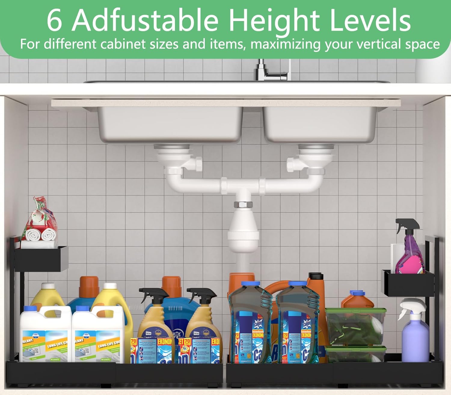 - 6-Height Adjustable Top Tier: Fits Tall Bottles Everywhere Customize clearance for 12""+ tall items in under bathroom sink organizers and storage. Versatile enough for kitchen & bathroom cabinet organizer needs with tool-free height swaps