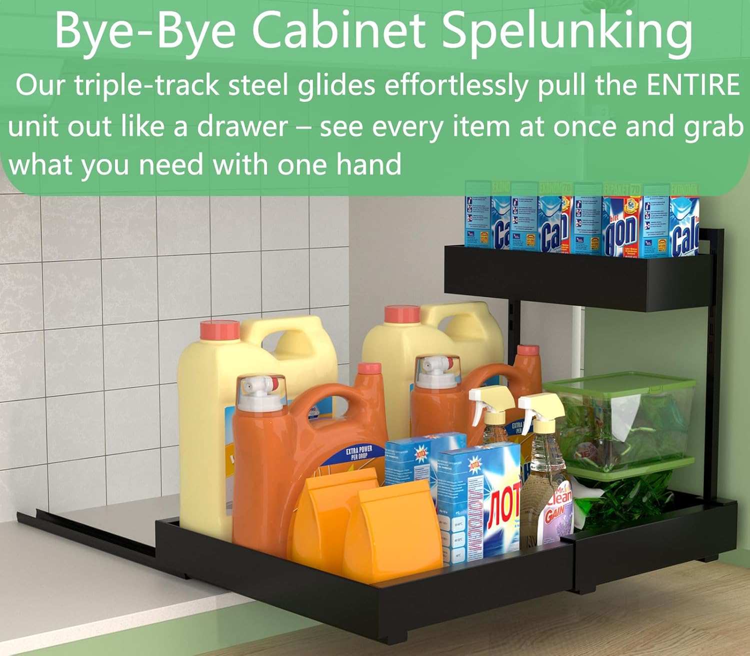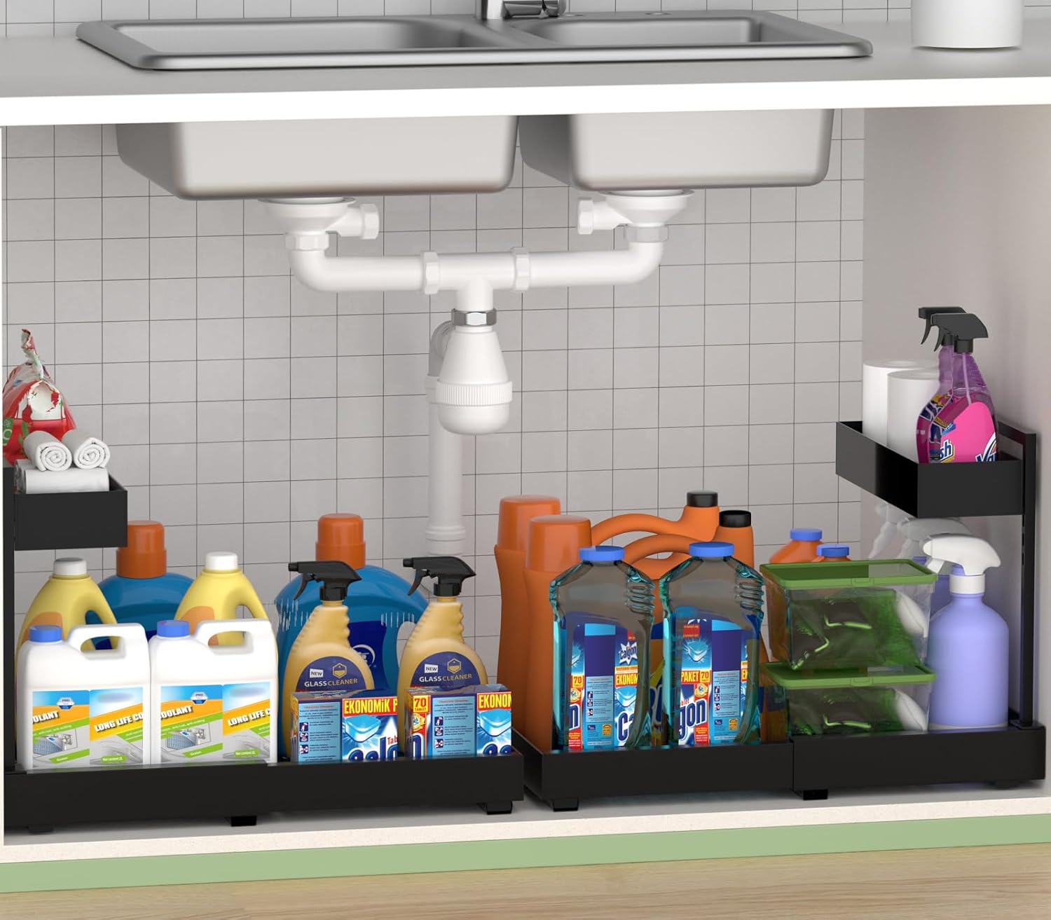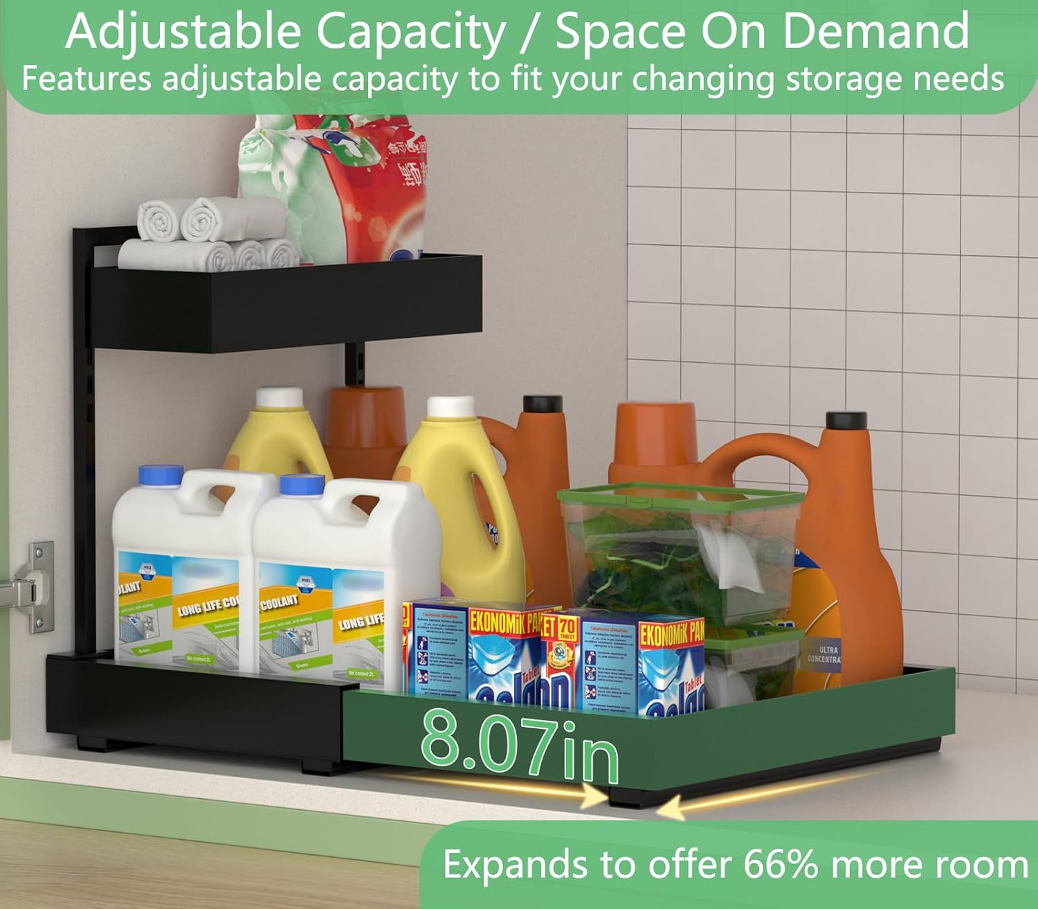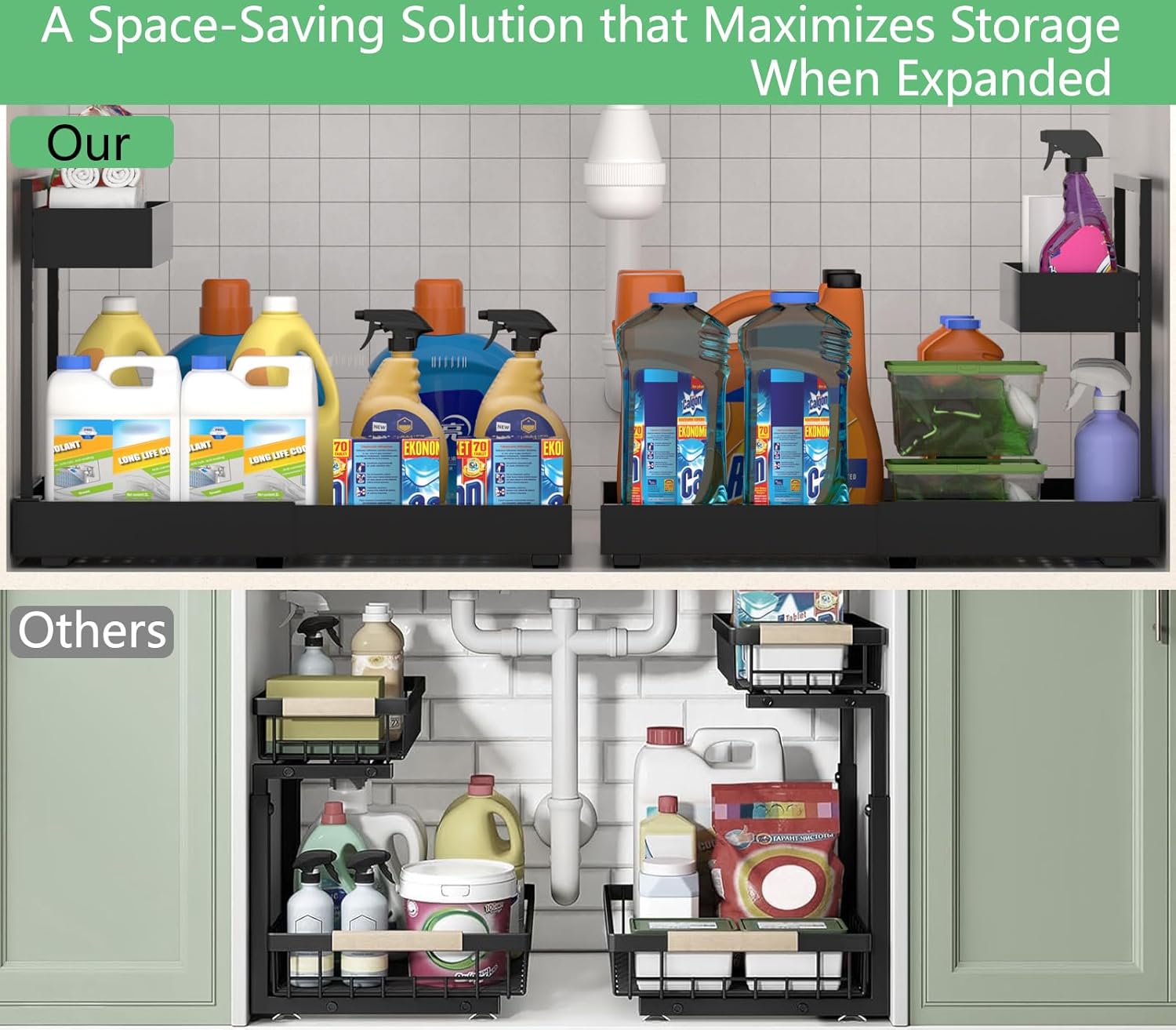 - Expandable Baskets - Ultimate Under-Sink Storage Solution Industry-exclusive expandable design instantly adds 66% storage space โ perfect for under kitchen sink organizers and storage. Holds bulky detergent jugs & cleaning supplies with no space waste