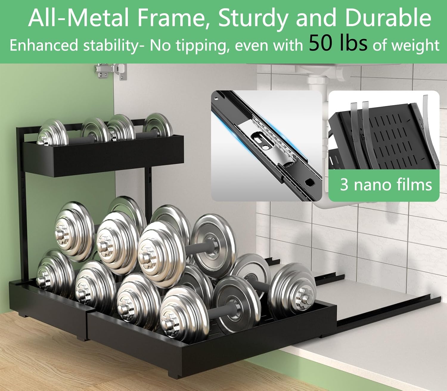 - 3-Slide Rail System: Buttery 8-Inch Full Extension Heavy-duty triple steel glides (not plastic!) enable smooth pull-out under sink drawers action. Reach back-corner items in under cabinet storage without kneeling or spills