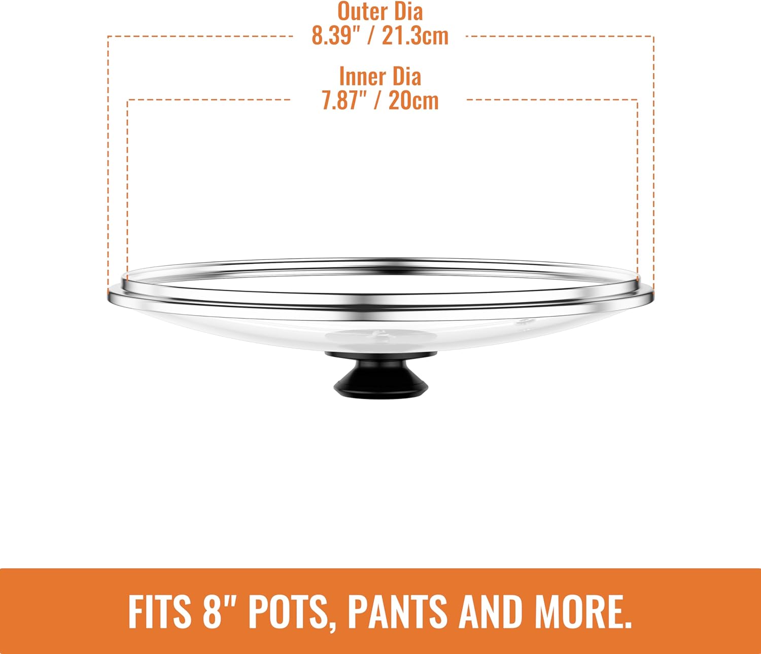 - VERSATILE FOR ALL COOKWARE & BAKEWARE: Compatible with various cookware & bakeware lids, including 8" pot lids, frying pans, skillets, cast iron, wok. A stylish and functional pan cover for any kitchen.