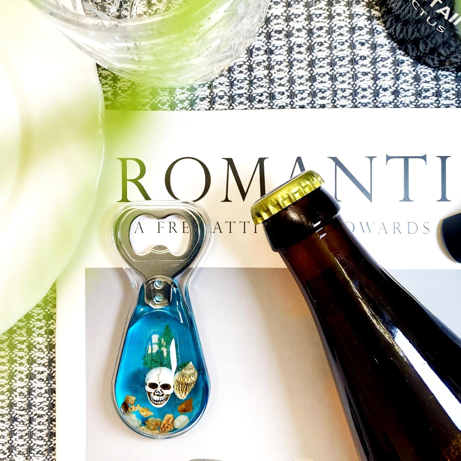 Halloween Ghost Skull Decor, Magnetic Bottle Opener, Original Design Skull Sinking in Ocean Blue Resin – Strong Magnet for Fridge – Gothic Halloween Gifts - Clear Blue