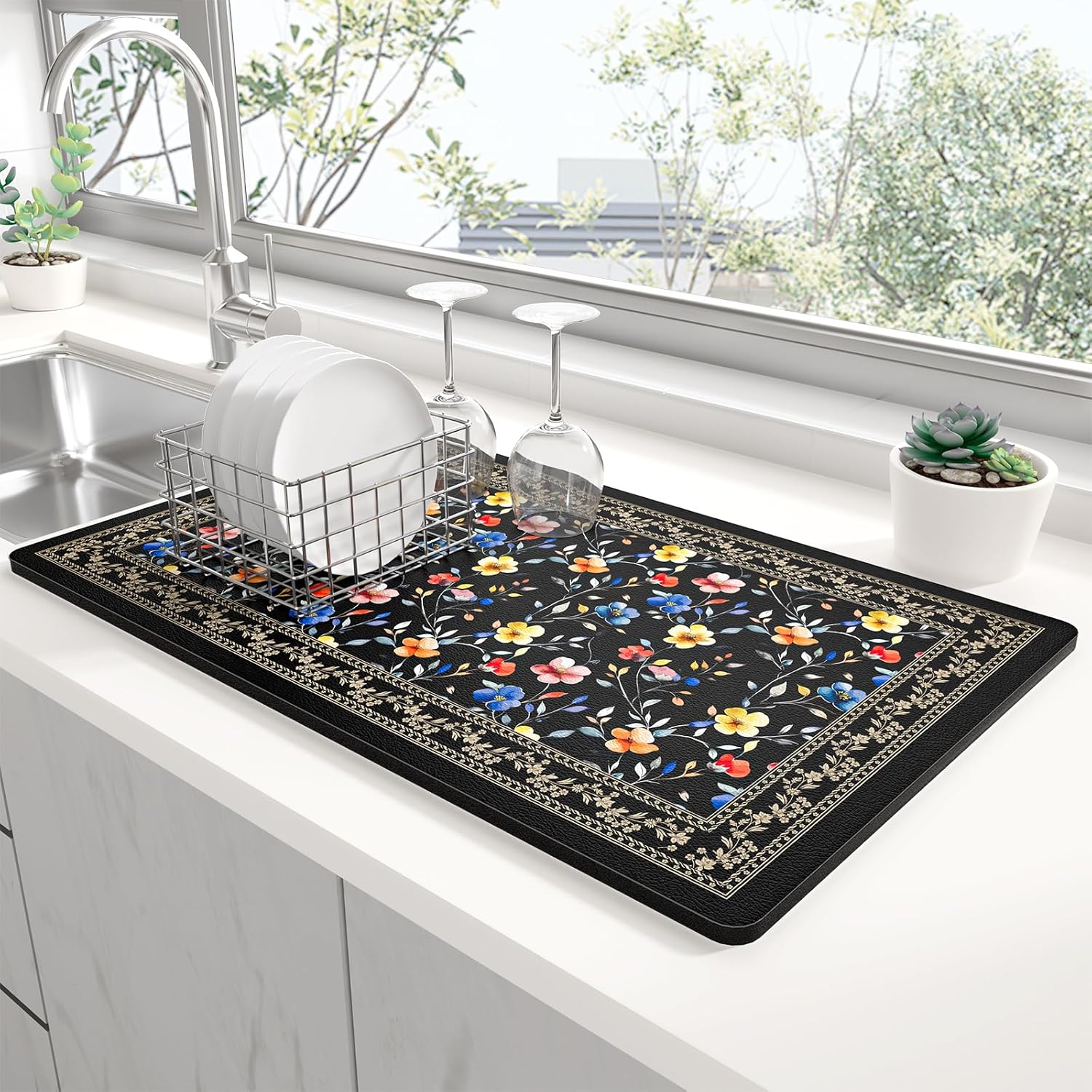- Stylish Kitchen Upgrade:Cute dish drying mat with boho, floral, or marble designs elevates any kitchen style. Vibrant fade-resistant colors complement farmhouse/modern kitchens.This stylish kitchen decor keeps kitchen counter dry while adding a chic touch