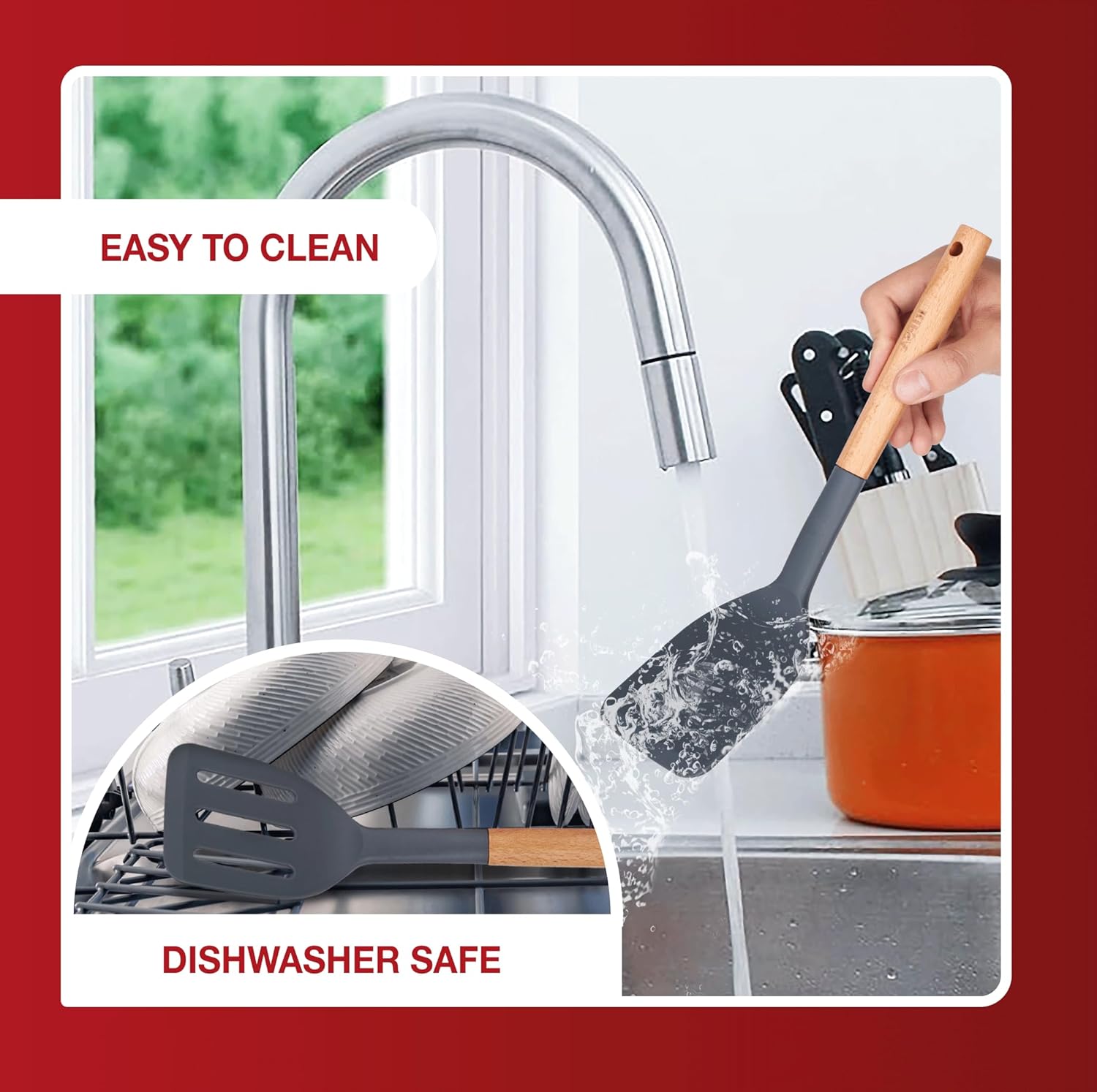 - EASY TO CLEAN AND MAINTAIN: To keep the wooden handles lasting longer, it’s best to wash them by hand with a soft cloth after use. This helps remove any leftover food or grease easily. Plus, the handy round hanging hole makes drying and storing the silicone spatula set quick and convenient.