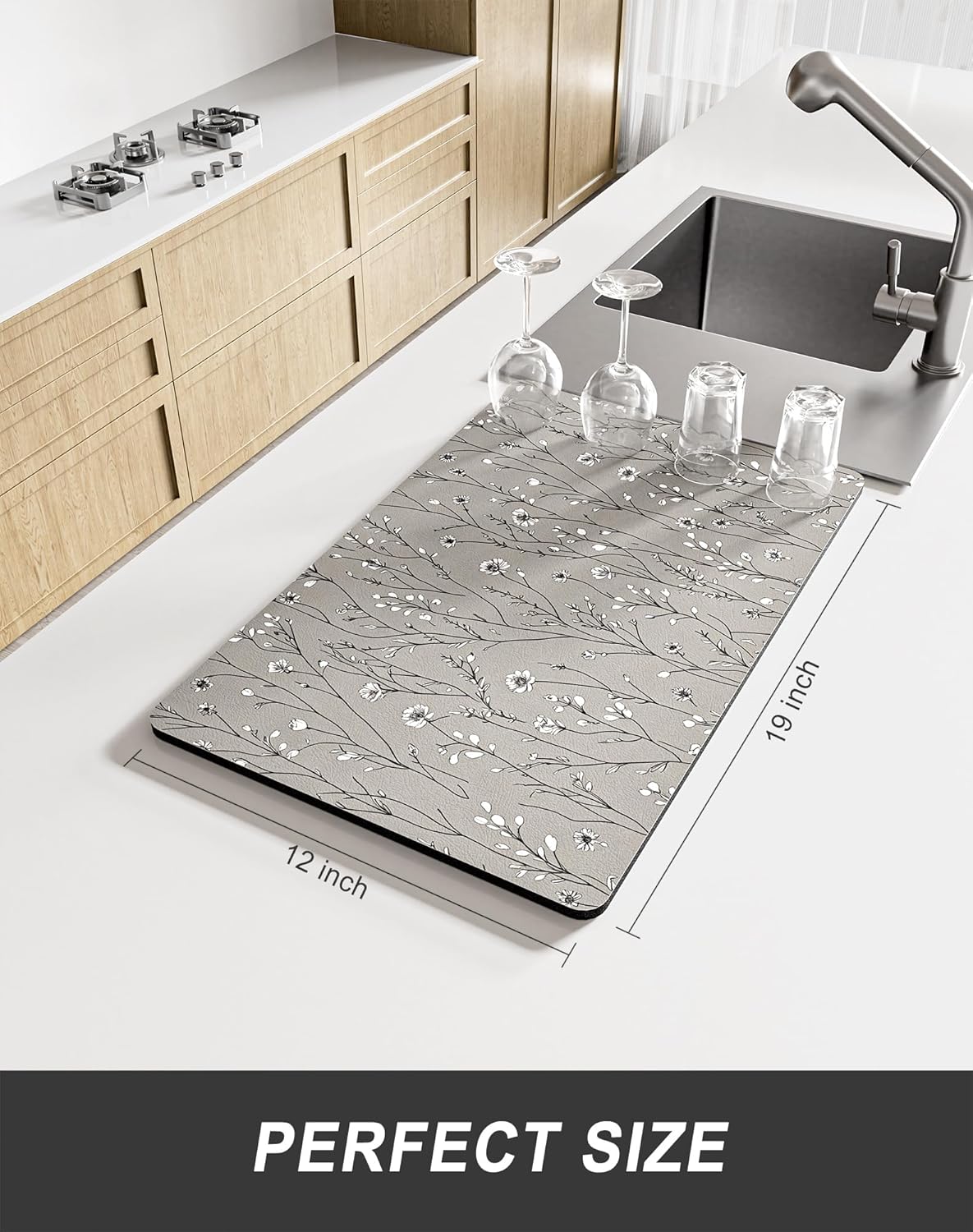 Rnivvi Dish Drying Mat for Kitchen Counter, 12 x 19" Cute Flower Theme Super Absorbent Draining Pad, Non-Slip Heat Resistant Coffee Bar Mats for Coffee Machine Station Accessories, Grey Dish Rack Pad
