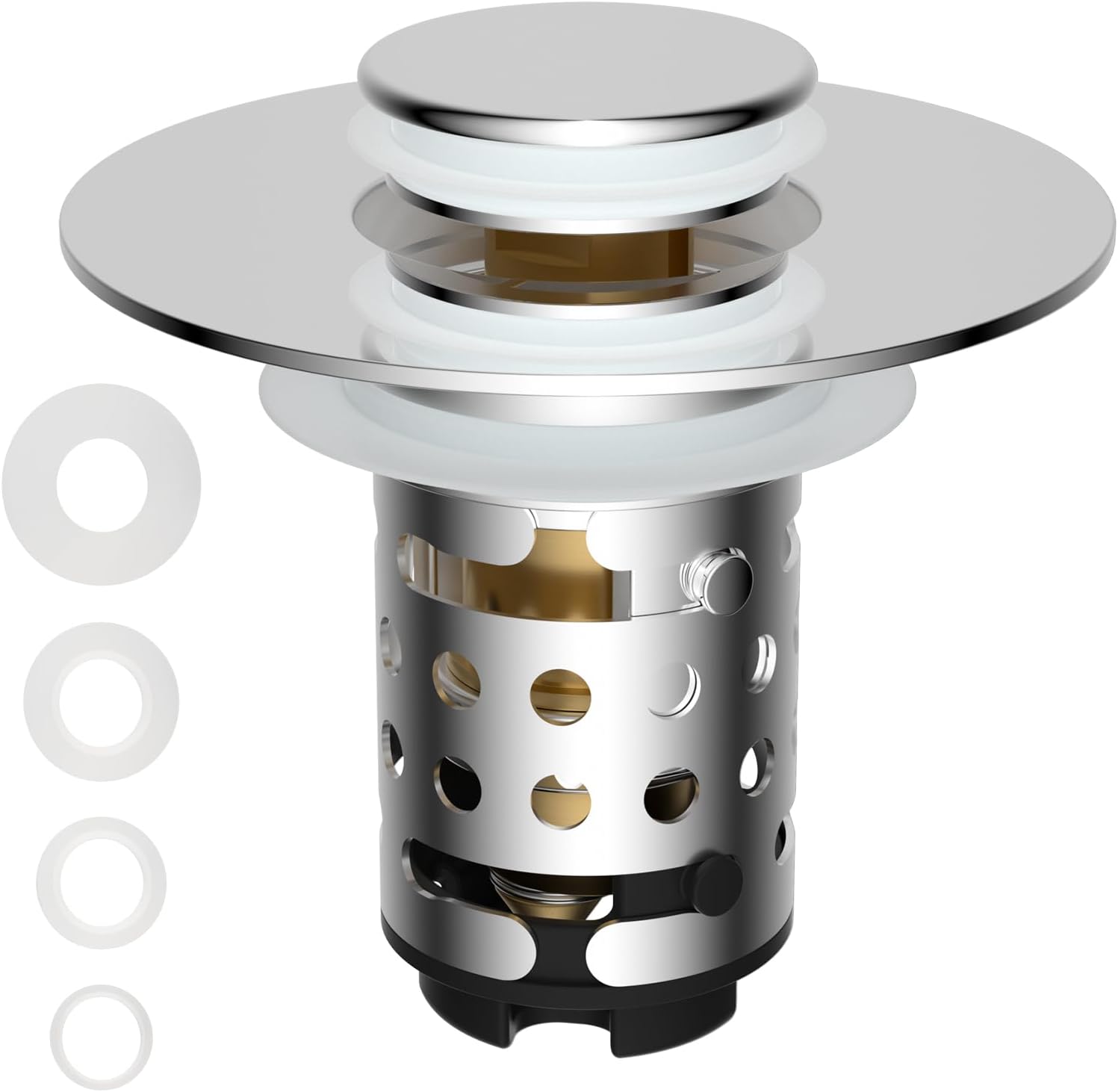 - No More Plumb Clogs: Upgrade your bathroom sink with this drain stopper that has a built-in pop-up brass bullet core mechanism for long-lasting use; An additional filter basket can catch hair and gunk and prevents jewels/rings and other small valuables lost, designed to prevent clogs effectively; The thick silicone ring keeps odors at bay while ensuring fast drainage