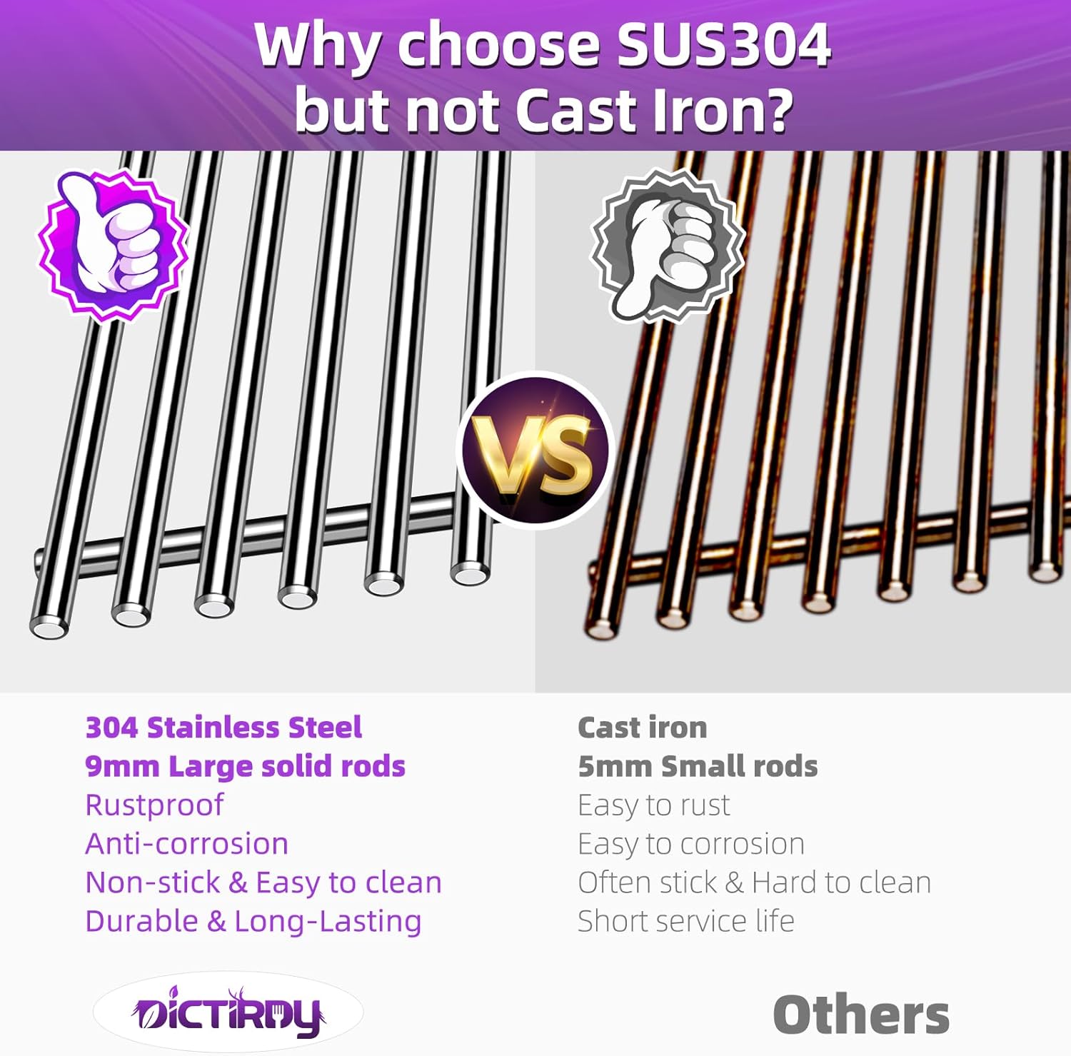 - 【Edge Grinding Design & Protect Your Hands】Our cooking grill grate is free of sharp edges, made with nice welds and smooth surface, no sharp edges and will not hurt your hands. Dictirdy spirit grill grates are made of high-quality 100% food grade 304 heavy stainless steel and well-engineered to prevent rust, which is durable with uniform heating and high corrosion resistance, non-magnetic, much more heavier and heavy duty. Best choice for your Weber Spirit 200 series gas grills.