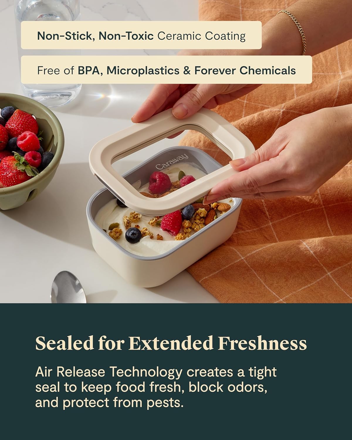 Caraway 2pc Glass Food Storage Set - 2.6 Cup Food Containers (2) - Non-Toxic Ceramic-Coated Glass - Air Release Technology - Compact & Stackable Design - Cream