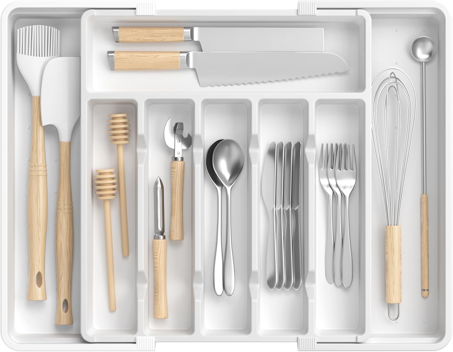 - Large Capacity: This silverware organizer offers an ideal space combination for different kitchen utensils. When folded, the six deep grooves can store most of your flatware like forks, knives and spoons. Expandable panels on the side can store larger kitchen utensils, such as grater, spatula, tongs and whisks