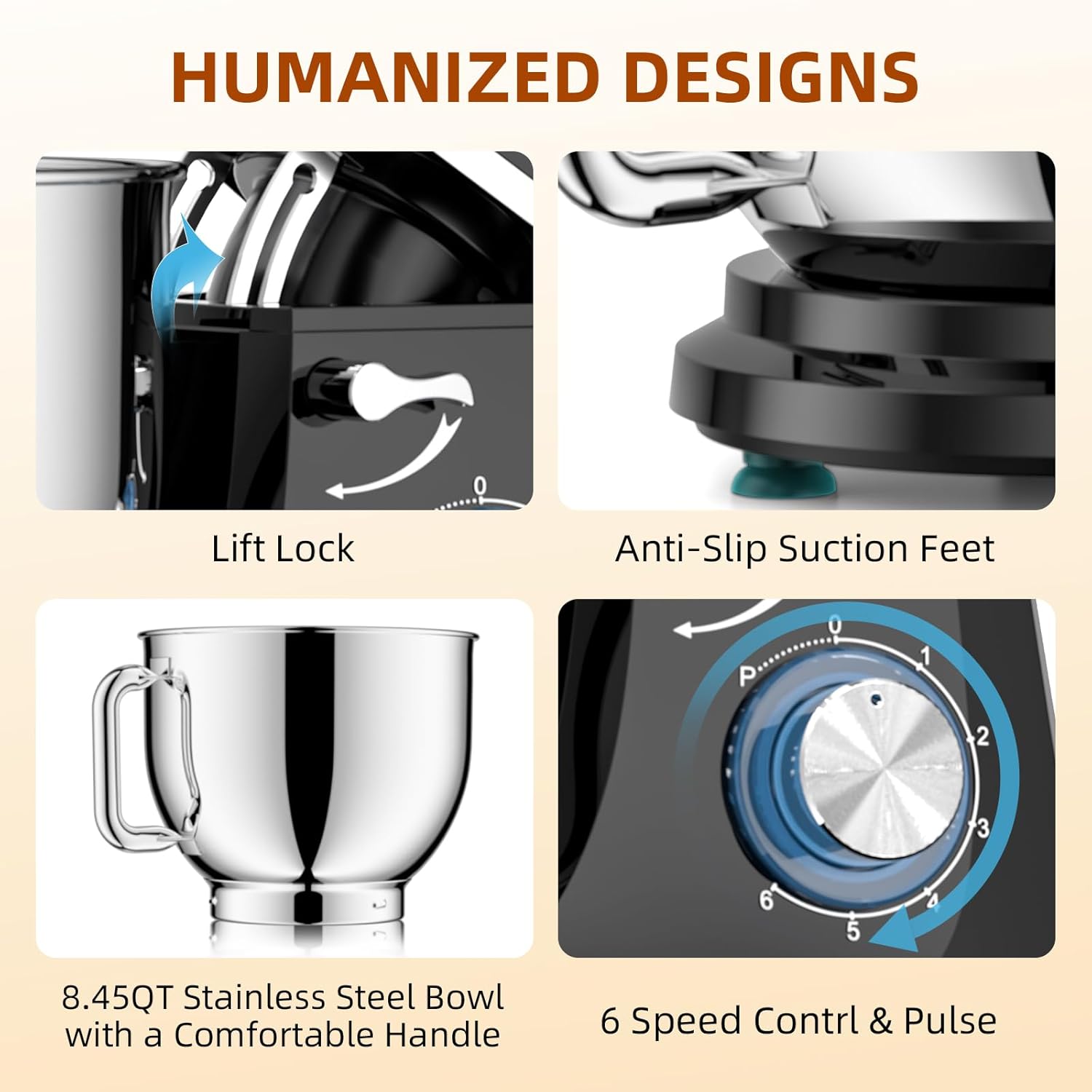8.45 QT Stand Mixer - 660W 6 Speed Large Capacity Kitchen Electric Mixer with Whisk Dough Hook Mixing Beater Household Food Mixer for Baking Cakes Cookie Bread Salad (Black)