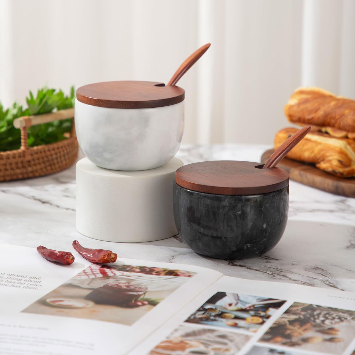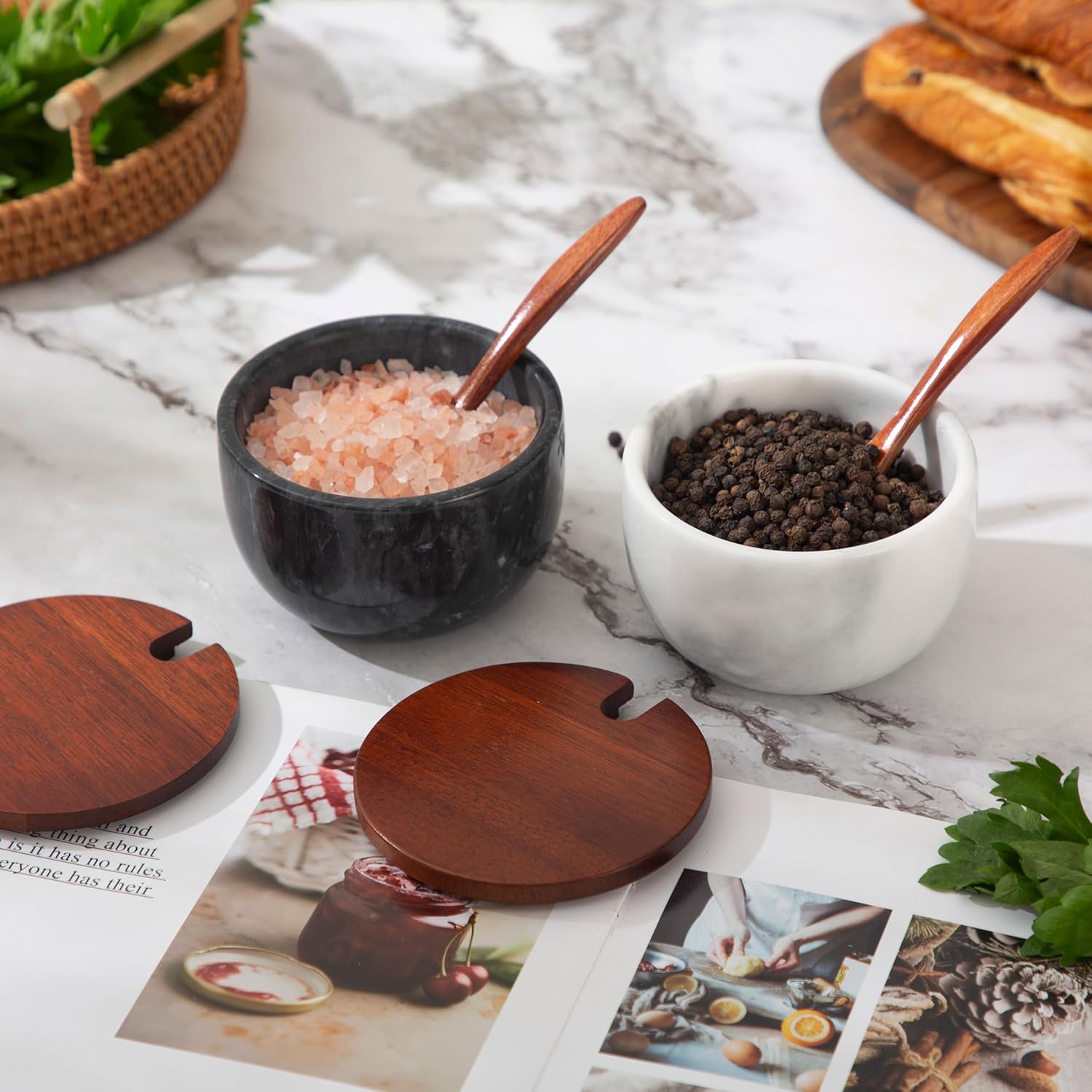 - The salt cellar is made of natural marble by hand grinding, with a polished exterior. Each is unique, and the cover is made of high-quality natural bamboo to keep out dust or bugs.