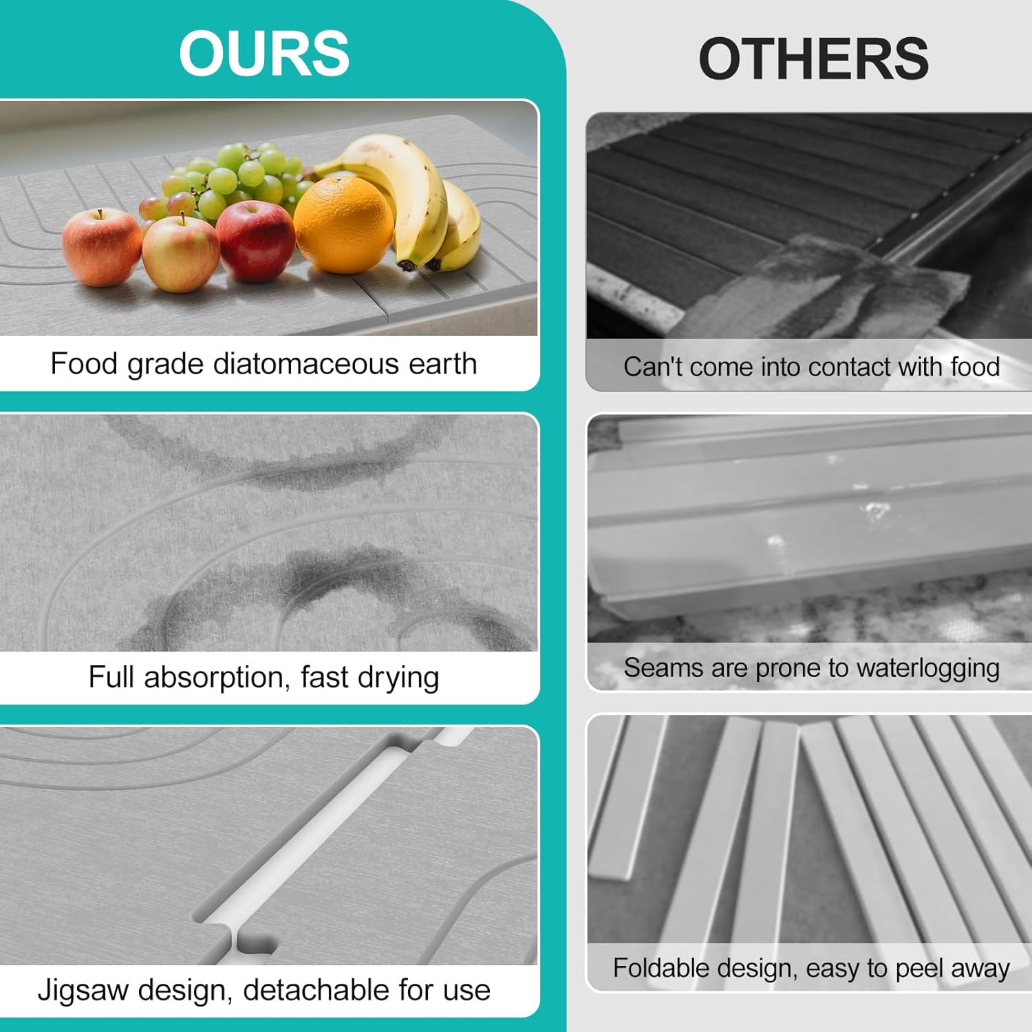 - Food-Grade Material: Made of high-quality non-toxic diatomaceous earth, the stone dish drying mat offers a sustainable alternative to silicone or fabric dish pads for drying. This quick dry stone mat for kitchen will not release harmful substances when in contact with food, so you can use it with confidence.