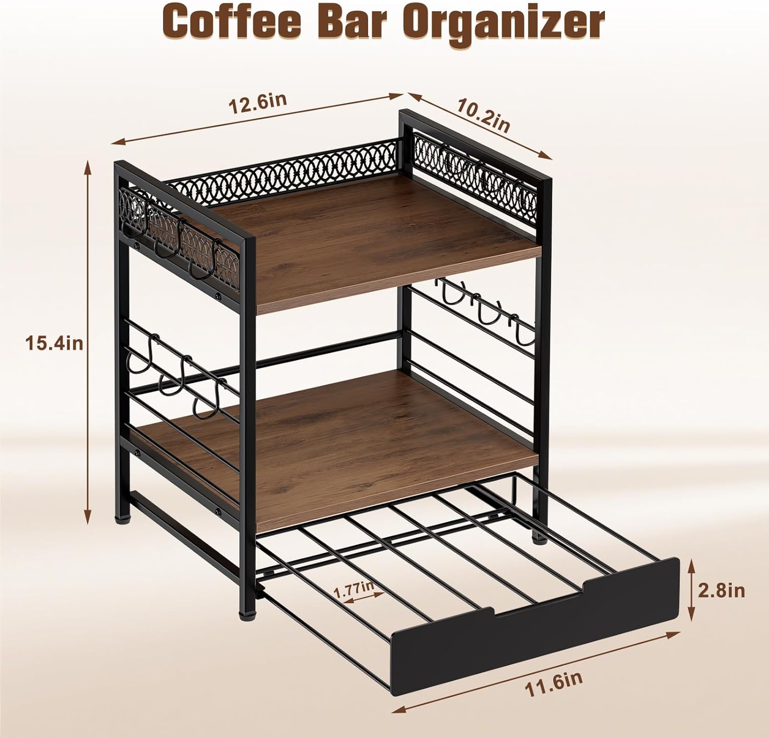 - 【3-Tier Larege Capacity】The top layer of coffee stand organizer is deaigned with three sides baffletop layer to prevent items from falling effectively. The display shelf on the second tier makes it easy to place all your coffee supplies, and the sliding drawer of the bottom can place 30 k-cup coffee capsules, maintaining easy access to your coffee needs