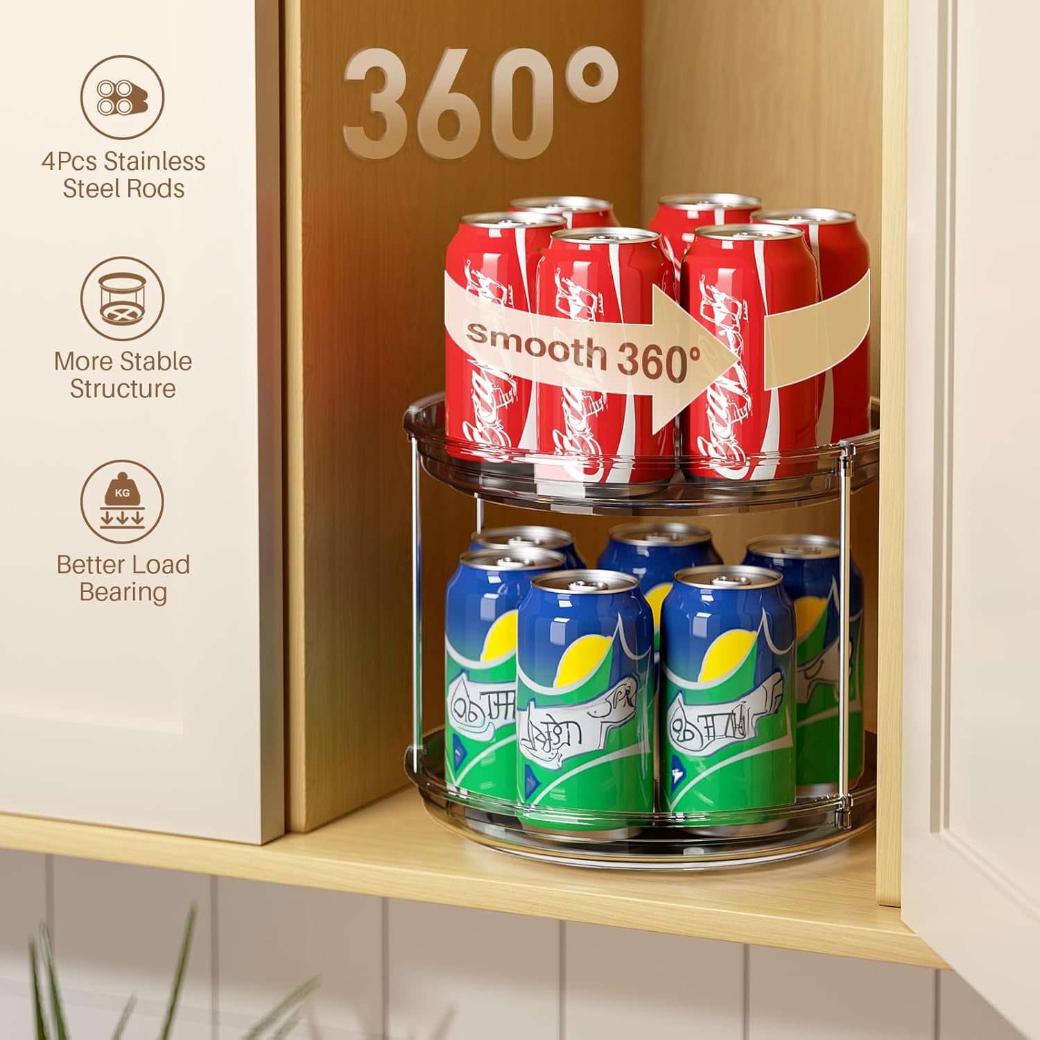 - Enhanced Metal Rods: Unlike other flimsy plastic spinning seasoning organizers, our lazy susan turntable for cabinet uses metal rods to connect the two tiers for a sturdy construction that ensures stability even when loaded with heavy jars
