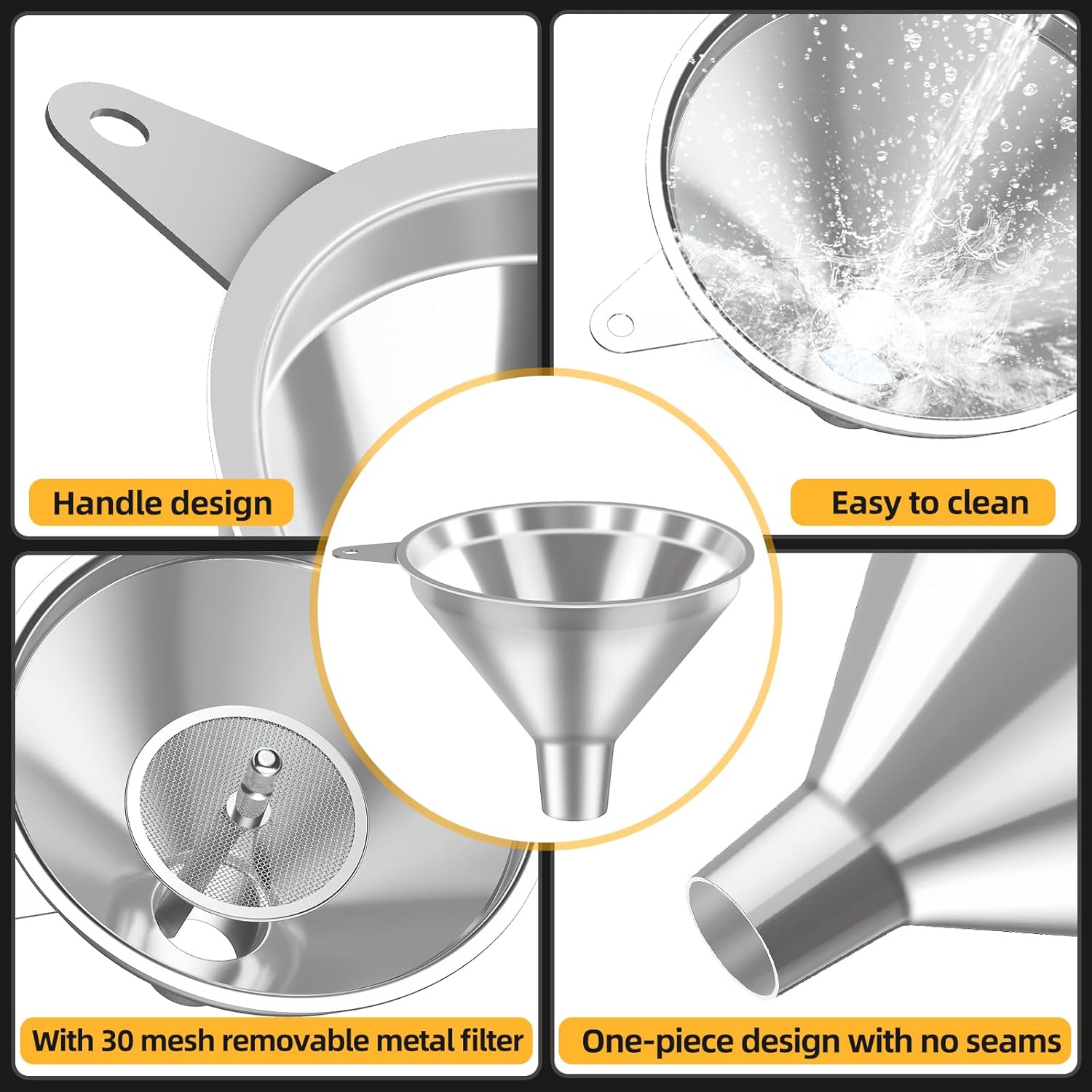 - MULTI-PURPOSE HOME ESSENTIAL: Whether you're filling spice jars, transferring cooking oil, or pouring liquids into bottles, the included removable 30 mesh stainless steel strainer makes it easy to filter out food scraps and fruit particles, these funnel kits are a must-have for you.