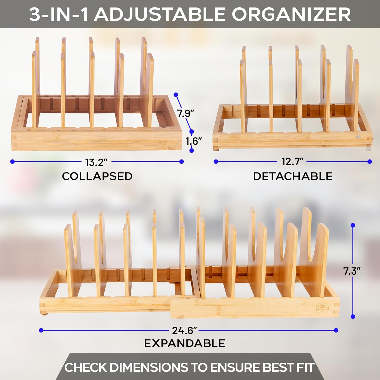- STRONG BAMBOO BUILD – Made with thick, polished bamboo that resists cracking and adds a clean, modern look to your kitchen. The pan organizers inside cabinet system is built to last and supports weight from large pans to cutting boards with ease.