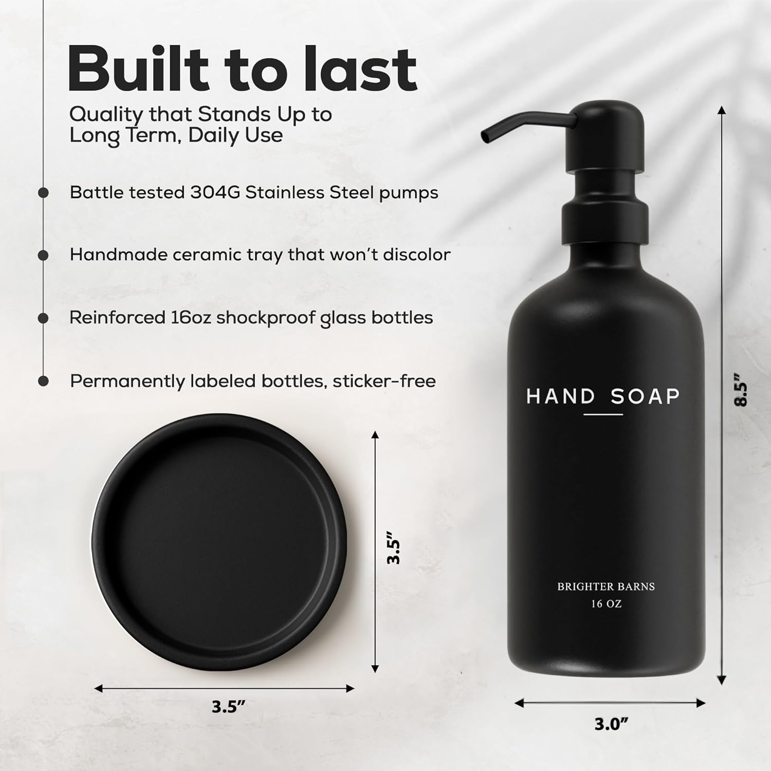 Black Glass Hand Soap Dispenser Bathroom Set by Brighter Barns - Bathroom Soap Dispenser Set with Tray and Stainless Steel Pump - Modern Decor for Kitchen, Hotel, Vacation Rental, Restaurants (Black)