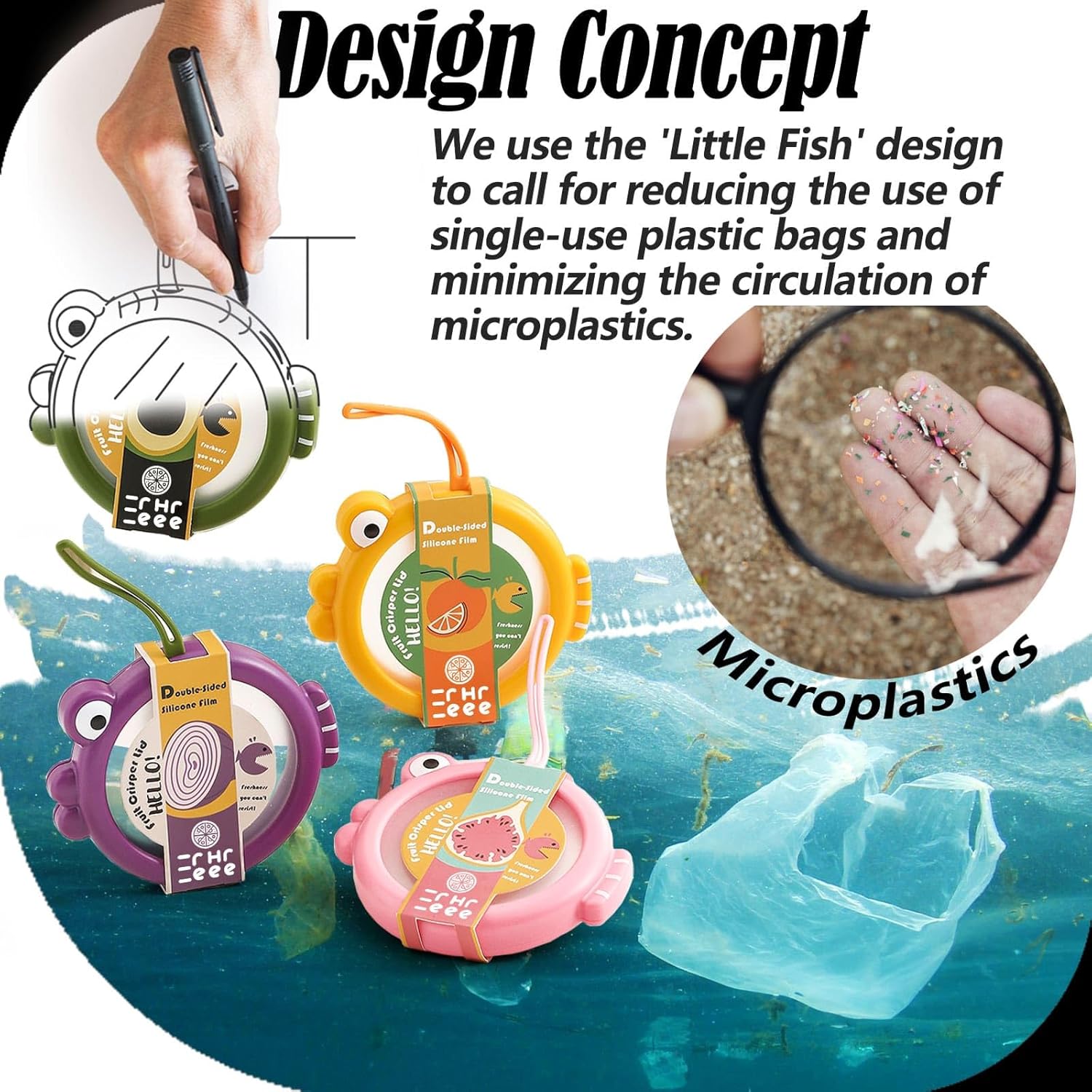 - Design Concept: Our sided silicone lids feature a fish shape, raising awareness of the microplastic issue in oceans. By reducing plastic bag usage, each lid helps prevent over 100 single-use bags from entering the ocean