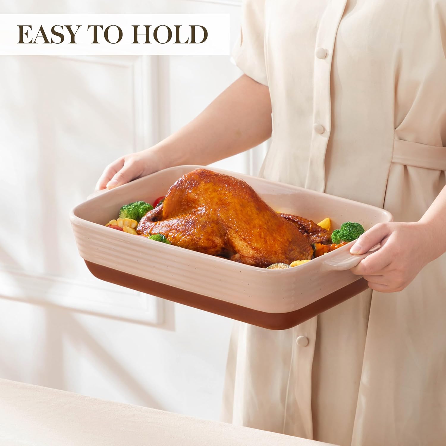 MALACASA 4.8 Qt Ceramic Oven Dish with Handles, 9 x 13 Inch Baking Dish Casserole Dishes, Deep Rectangular Lasagne Dishes Bakeware for Roasting (Khaki & Pink), Series TARA