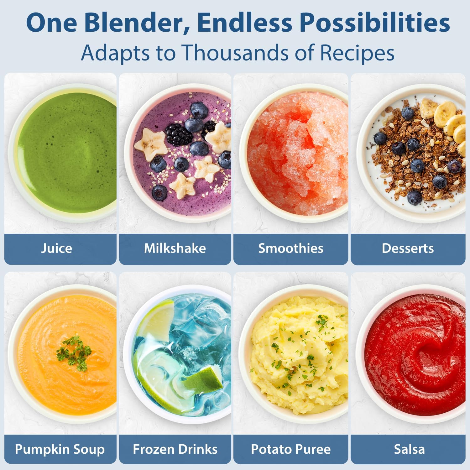 - Smart 3+7 Programs Control:The smoothie blender simplifies operation, preset smoothies, juices, crushed ice, one button directly. Seven adjustable speeds allow seamless task switching and precise texture control, empowering you to create diverse flavors. These versatile functions support endless culinary experiments, making meal preparation effortless.
