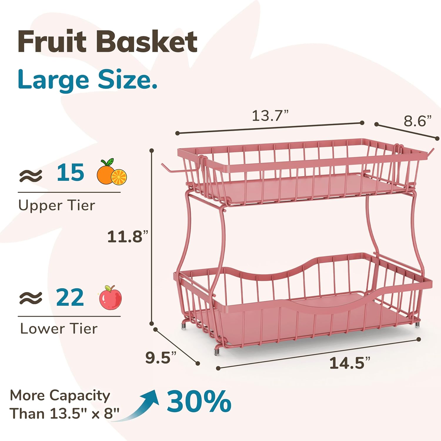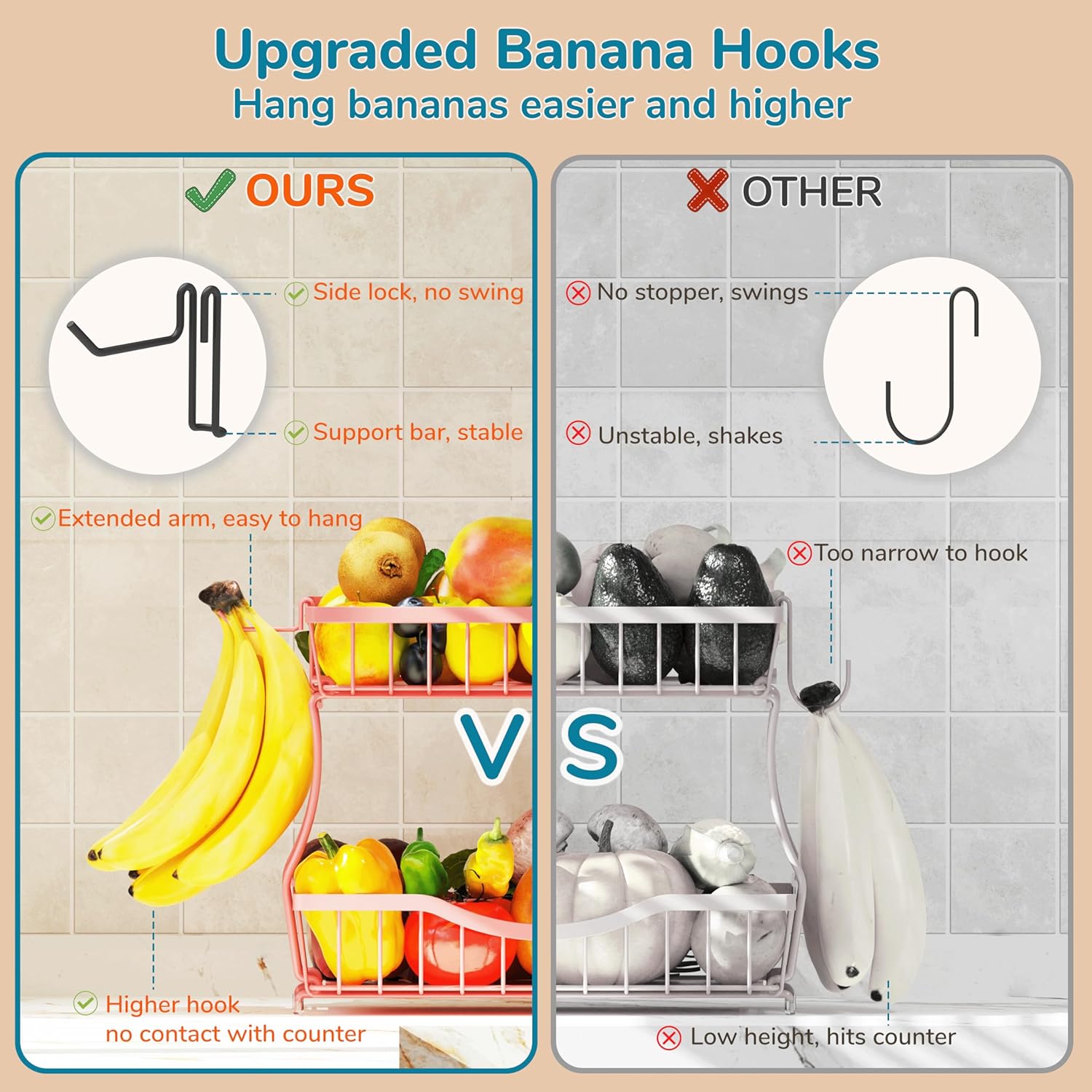 Large 2-Tier Fruit Basket for Kitchen Counter with 2 Banana Hangers – Metal Fruit Bowl for Onion, Vegetable, Snacks, Breads Storage – Countertop Organizer – Pink