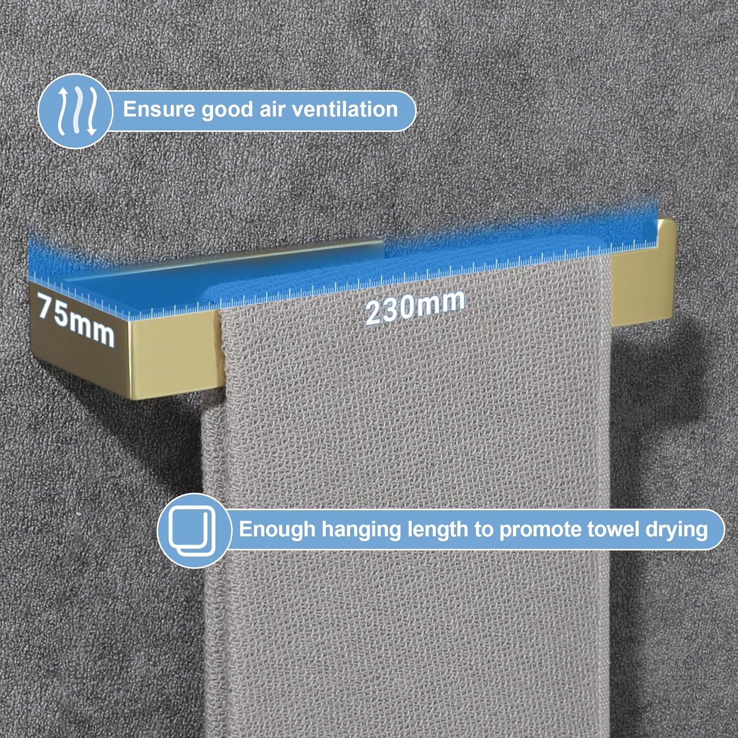- 10 INCH TOWEL BAR - The overall length of the hand towel bar for bathroom is 9.45". The length of hanging space is 8.6". 2.18 inches apart from the wall for quick and thorough air drying.