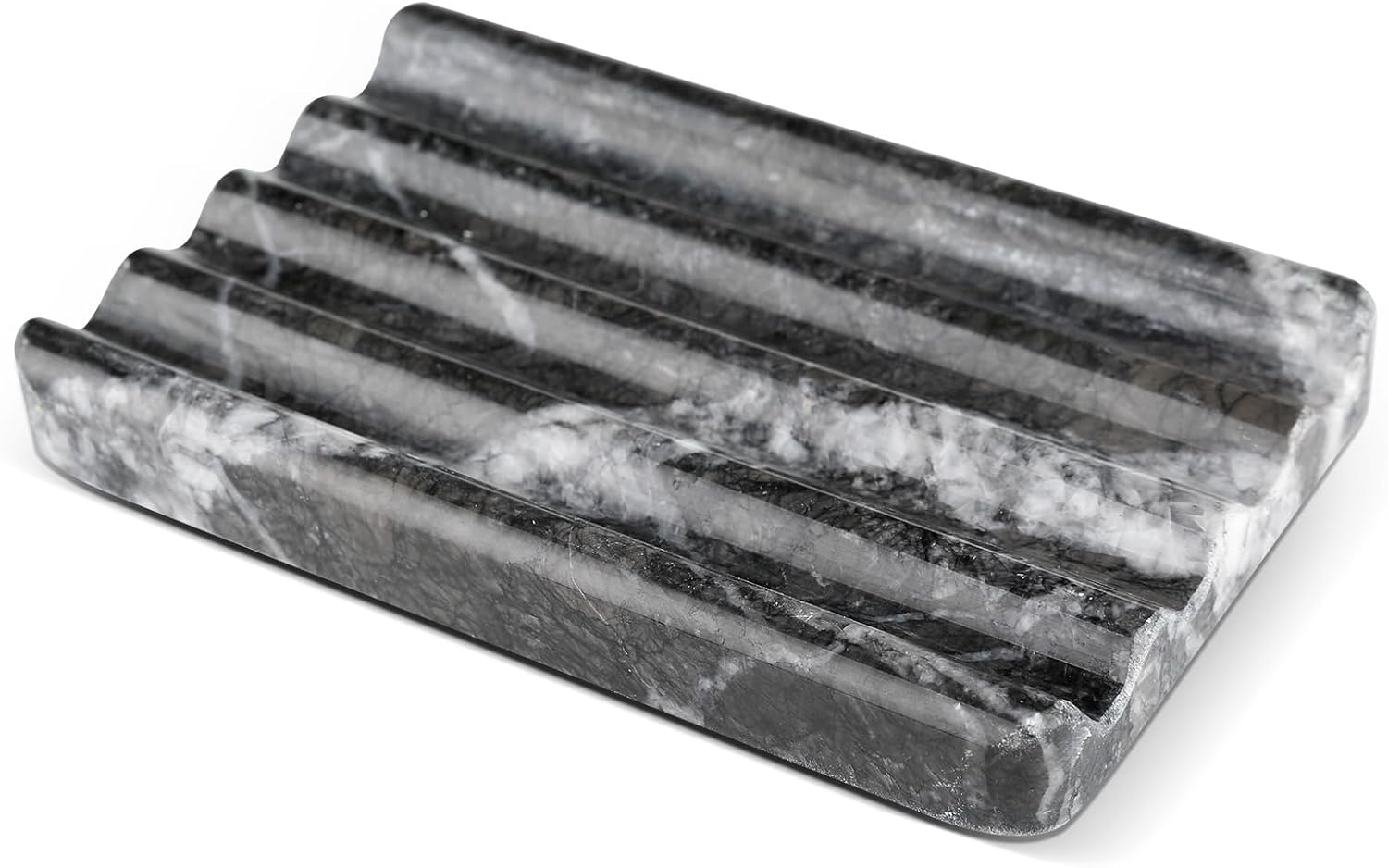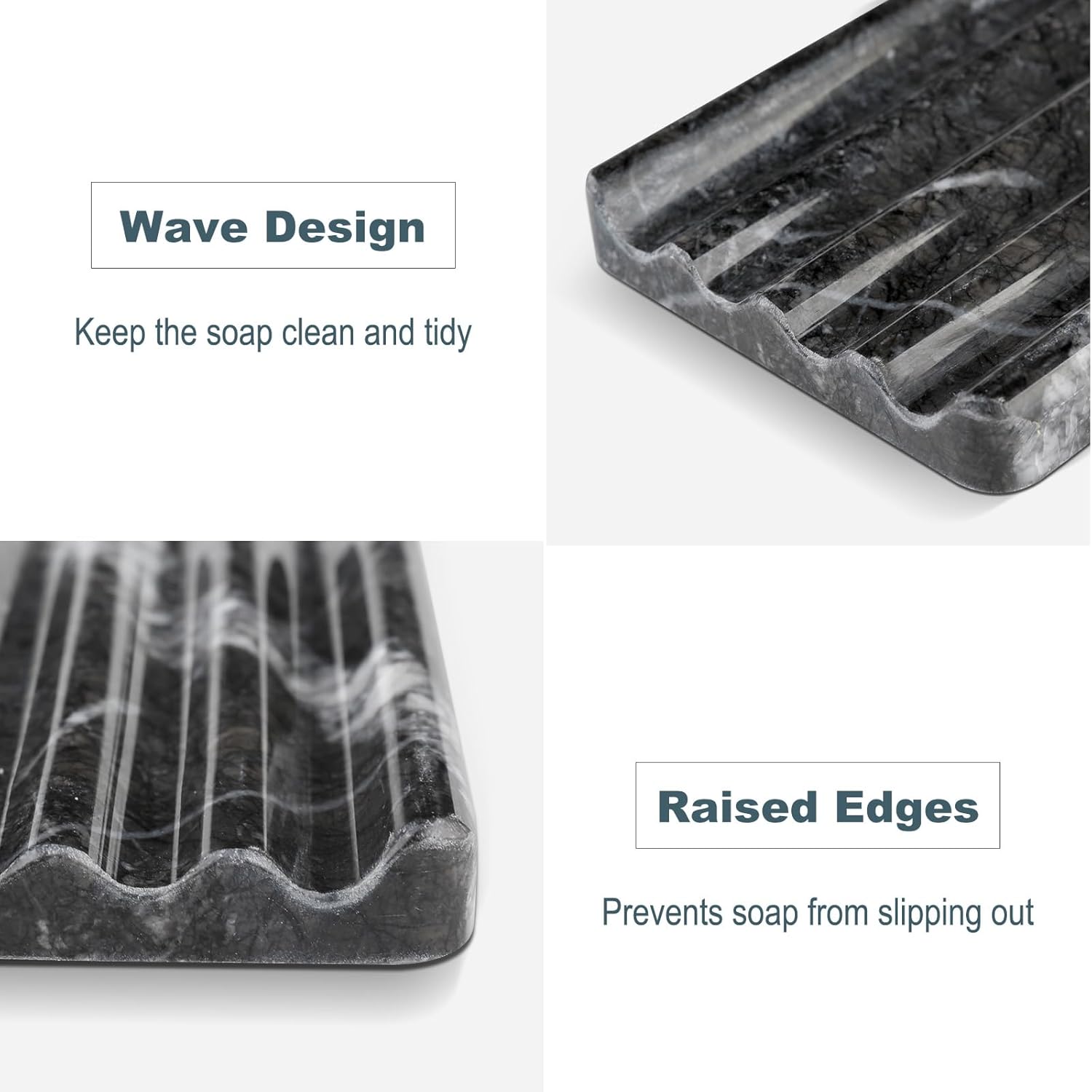 - EXCELLENT DESIGN: Square bar soap dish for holding soap, designed in a wave shape with raised edges. This soap dish drains the soap effectively, preventing it from slipping out and keeps soap clean and dry. The heavy marble soap holder comes with 4 non-slip pads, the pads are under the box for better water leakage.