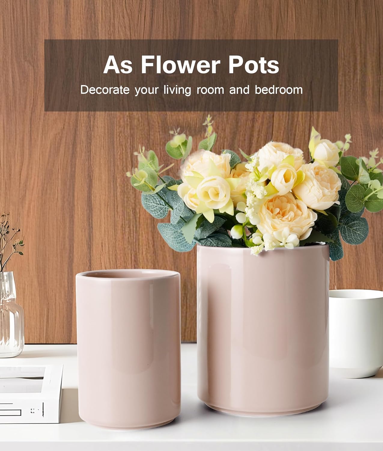 - 【Thoughtfully Sized, Set of 2】 Our utensil holder set includes 2 carefully proportioned holders for your kitchen accessories. The larger holder(H6.4" x D5.4"), is designed to comfortably store around 15 spatulas or utensils; The smaller holder(H5.4" x D3.9"), is suited for the organized arrangement of up to 10 sets of flatware. Keep your kitchen tools neatly arranged and easily accessible