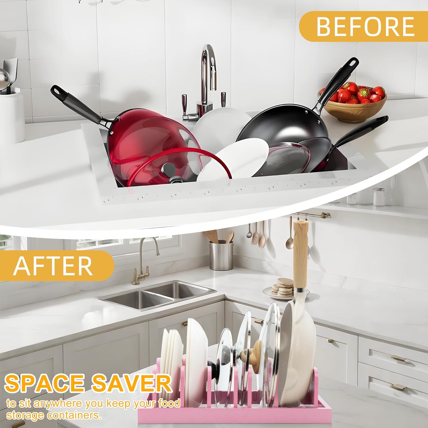 MinBoo Bamboo Pot Lid Organizer Pot Lid Holder, Pot and Pan Organizer Drawer Organizer for Pot Lids, Pans, Dinner Plates, Reusable Containers in Cabinet Storage,Pink