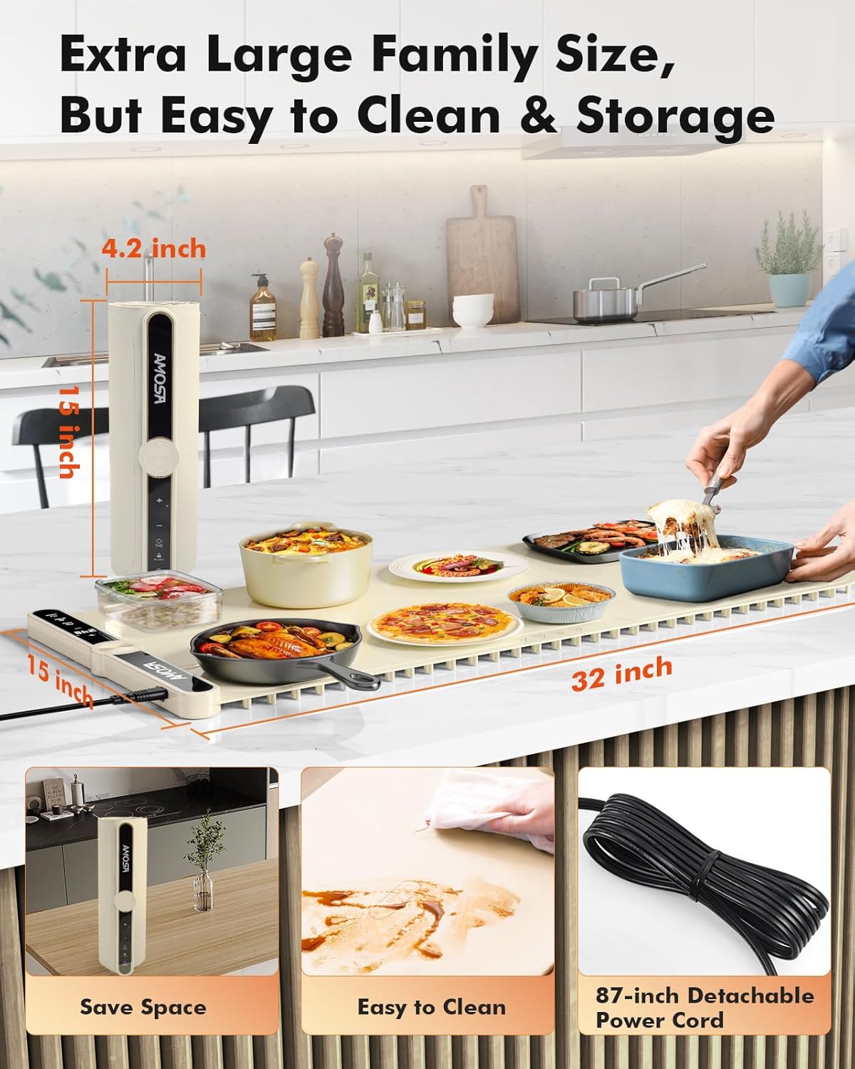 - 【Extra Large Size & Easy Store and Clean】Made of high-quality food-grade silicone material, no odor, comfortable touch and durable. Its surface is splash-proof, oil-proof, and stain-proof, and can be cleaned with a light wipe. The silicone used in the warming mat has excellent flexibility, is easy to roll up for storage, saves space and portable. The electric warming tray can be unfolded to 31.5 inches * 15 inches when in use, and is also equipped with a detachable power cord extended to 87 inches to meet your daily use needs.
