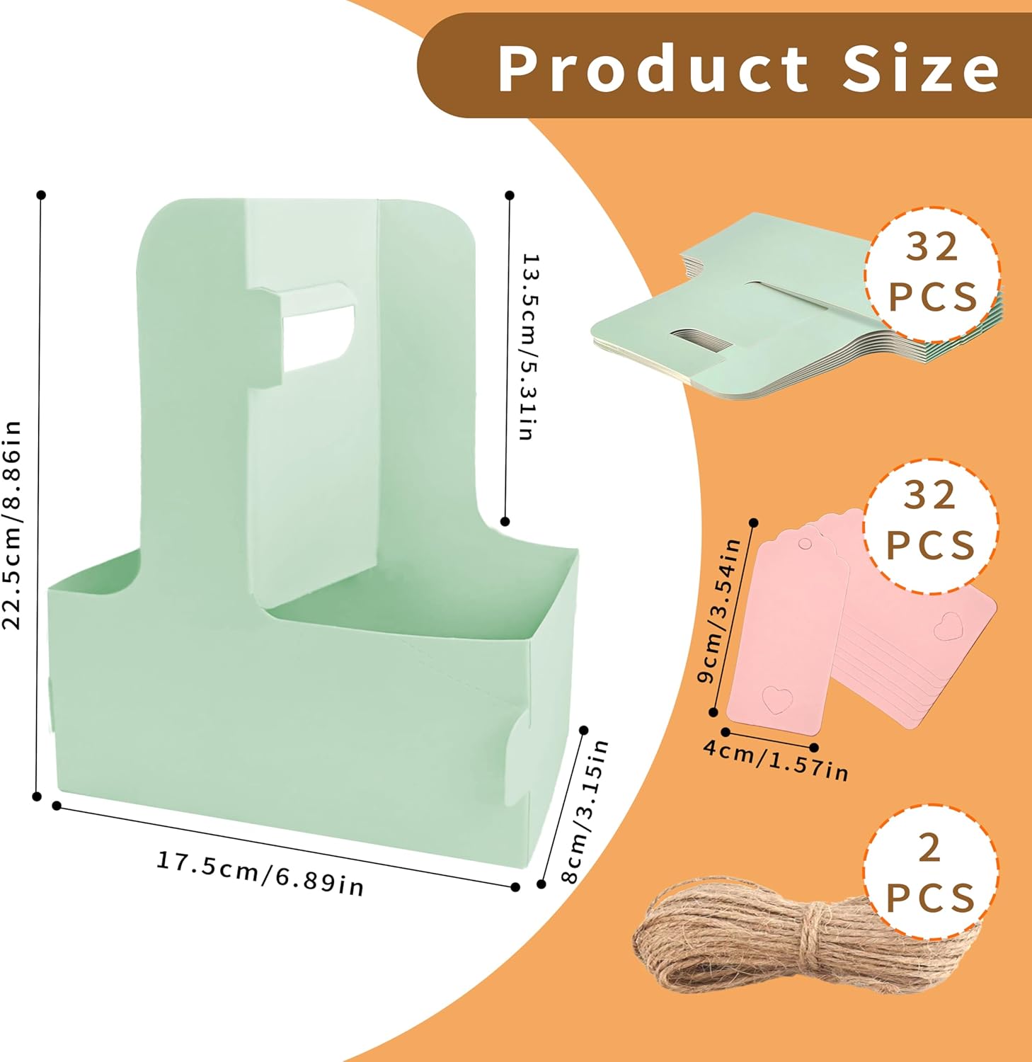 2 Cup Drink Carrier,32 Pack Coffee Cup Holders with Handle,Cardboard Cup Holders for Hot or Cold Drinks,Coffee Carrier with Ribbon and Card,Food Delivery Services and Bouquet(Green)
