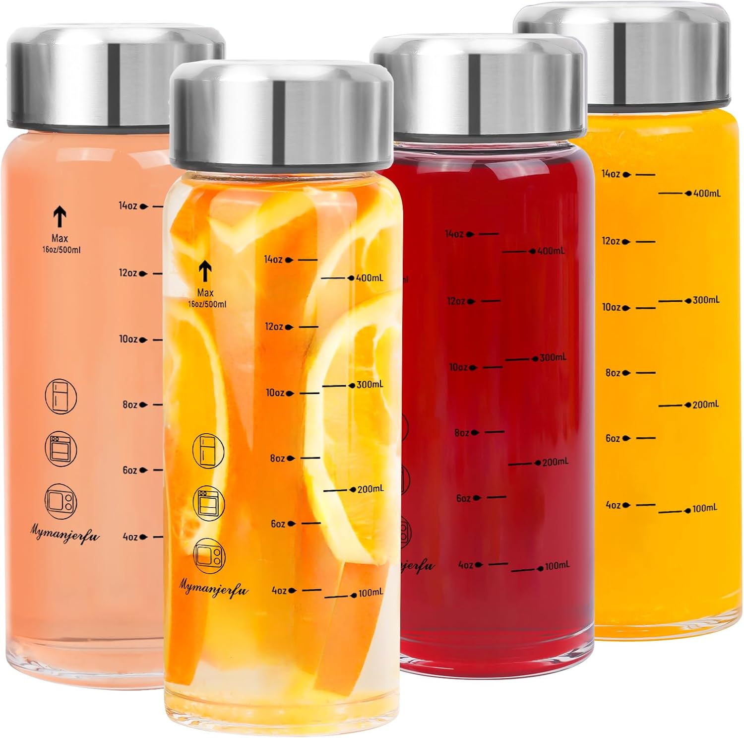 Glass Juice Bottles 4 Pack 16 oz - Wide Mouth Glass Water Bottles with Lids - for Juicing, Smoothies, Milk, Protein, BPA Free, Reusable, Stainless Steel Lids, Leak Proof, Shaker bottle [16oz/500ml]