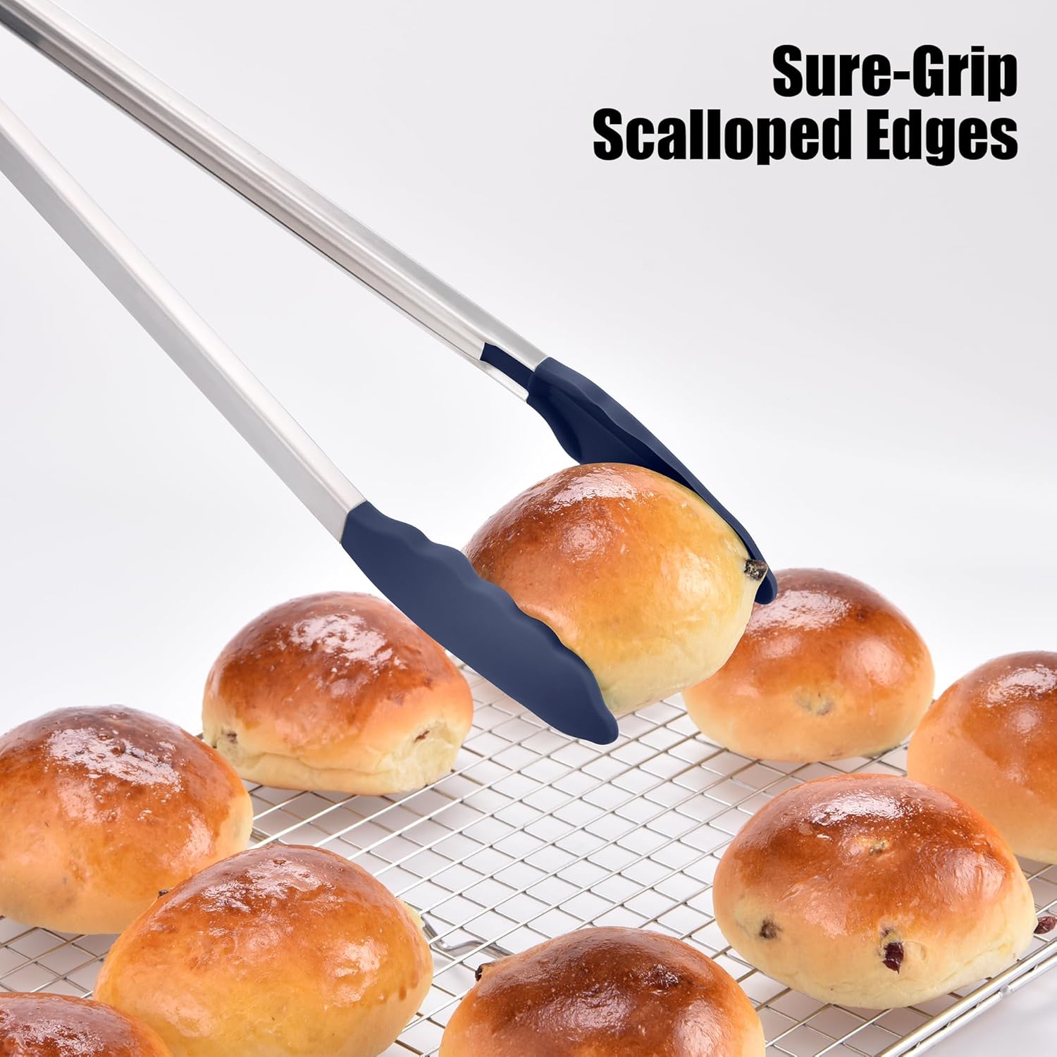 Doosu Kitchen Tongs for Cooking - 600°F Heat Resistant Food Tong with Non-Scratch Silicone Tips, Heavy Duty Stainless Steel Locking Tong for BBQ, Grilling Steak, Serving Salad Pasta (16in, Navy Blue)