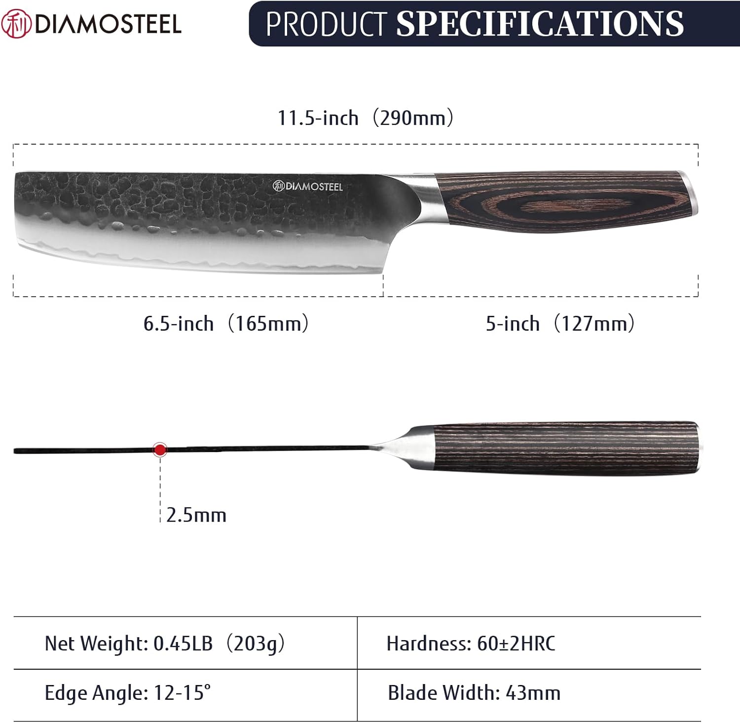 - Premium Triple-Layer Steel Blade - Say goodbye to dull kitchen knives. Our Diamosteel nakiri knife is crafted from high-quality 9CR18MOV three-layer composite steel, boasting a sharp edge honed to 12-15° and a hardness rating of HRC58-60. This ensures superior edge retention and rust resistance, making it your dependable cooking knife for years of precise slicing and dicing.