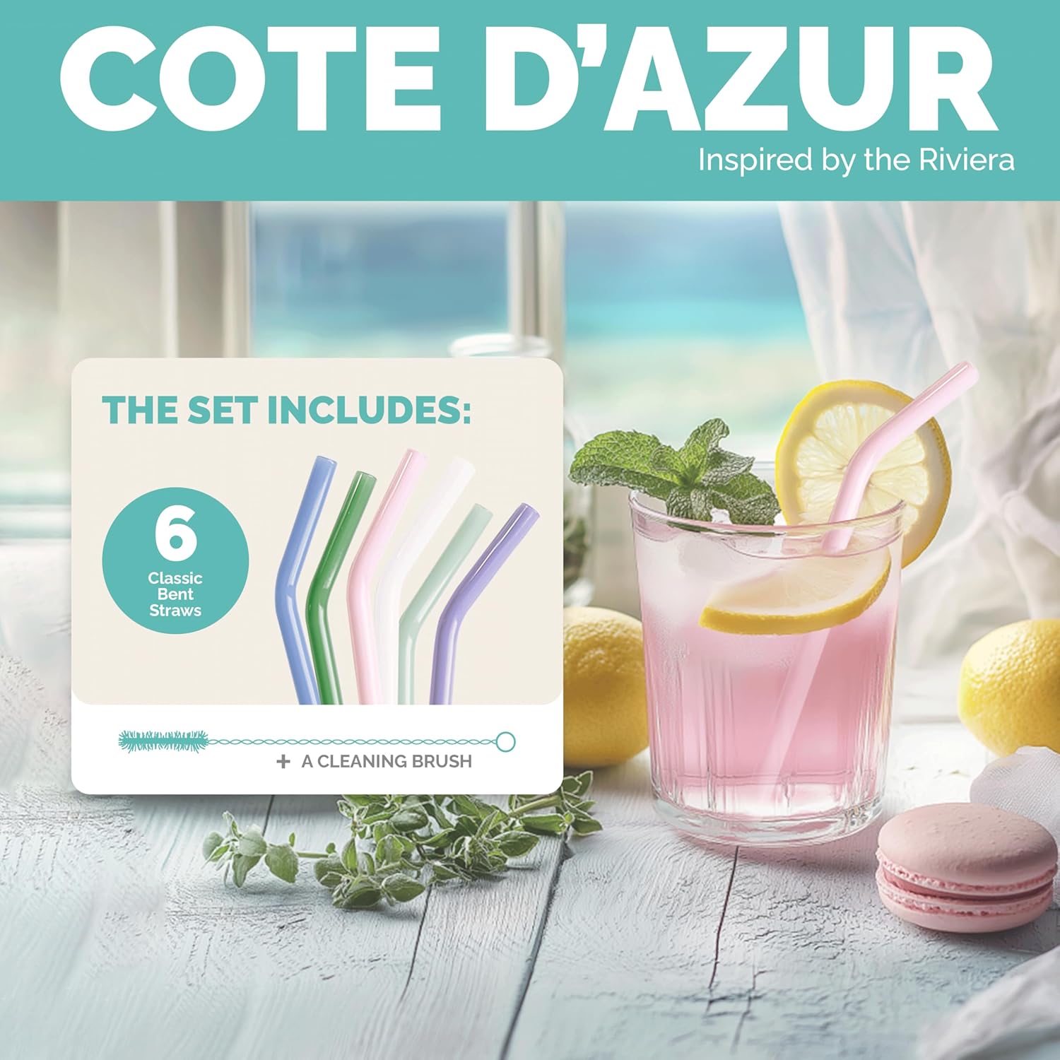 Simply Straws 6 Inch Glass Straws Bent (6-Pack) – Reusable Glass Straws for Low Balls & Stemless Glasses, with Cleaning Brush – Dishwasher Safe, Hot & Cold Use, BPA-Free (Cote d'Azur)
