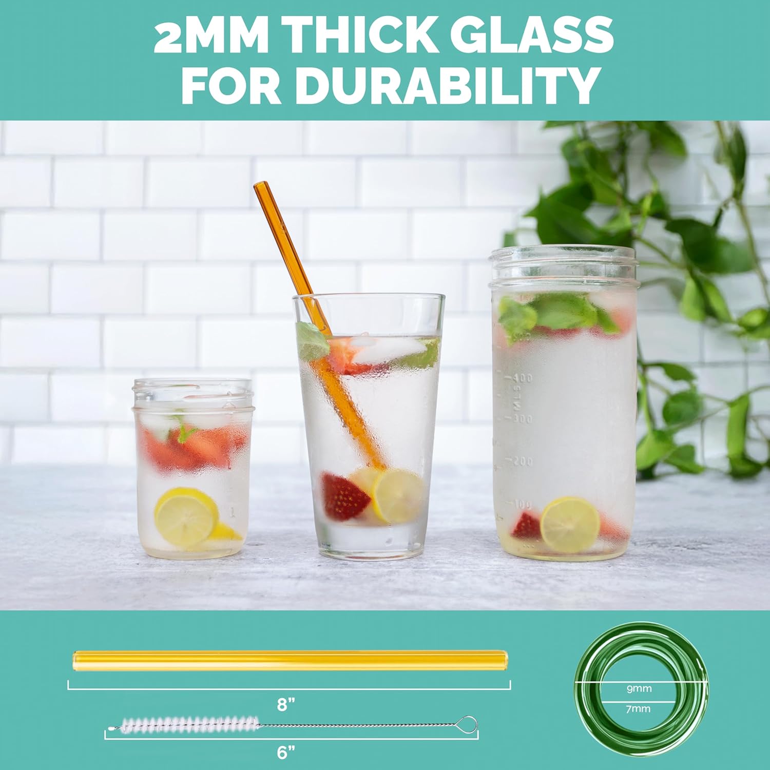 Simply Straws 8 Inch Glass Straws Straight (6-Pack) – Reusable Glass Straws for Pints & Juice Drinkware, with Cleaning Brush – Dishwasher Safe, Hot & Cold Use, BPA-Free (Fjord Mist)