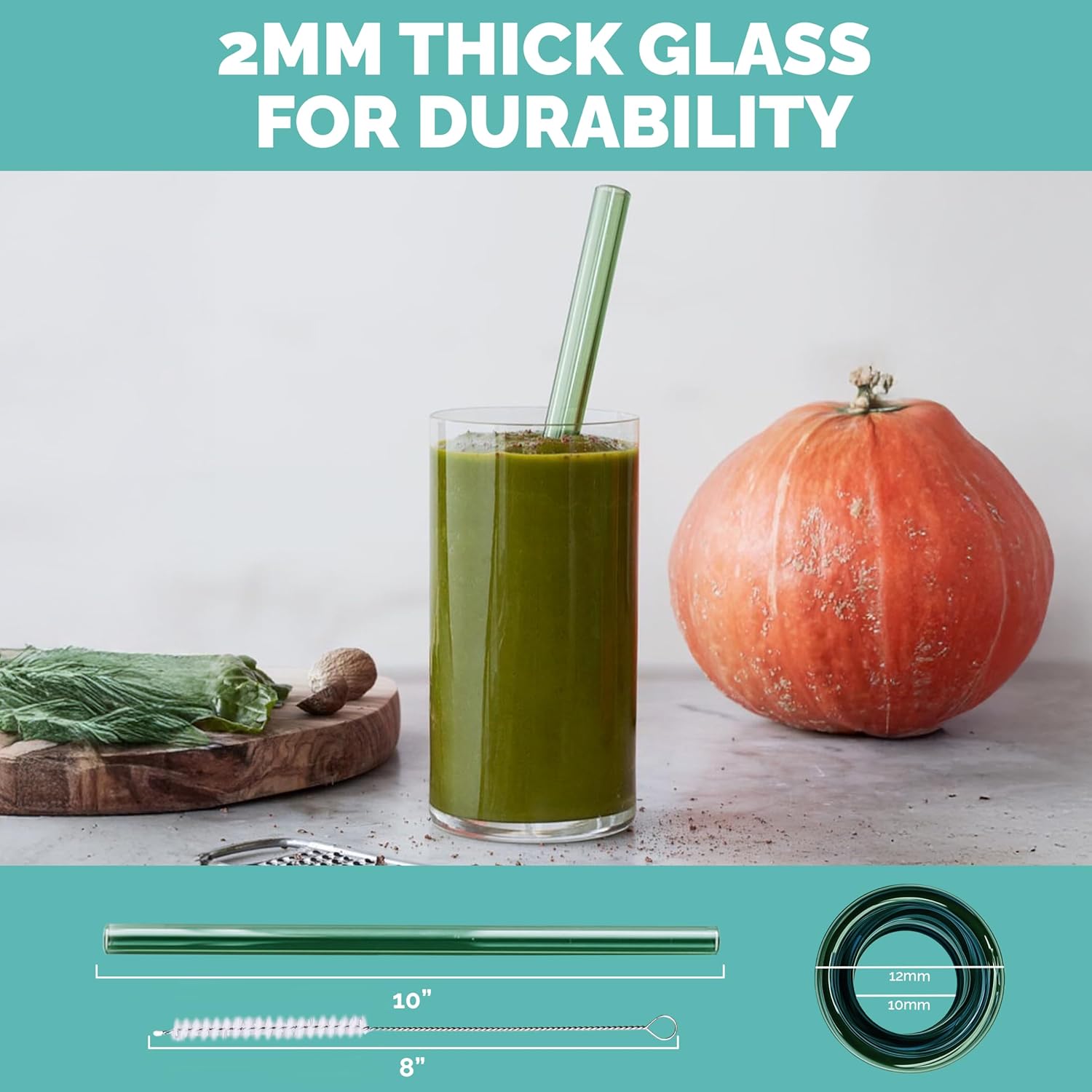 Simply Straws Wide Glass Straws (6-Pack) - 10in x 12mm Reusable Glass Smoothie Straws for Milkshakes, Juices & Slushies, with Cleaning Brush - Dishwasher Safe, Hot & Cold Use, BPA-Free (Seaglass)