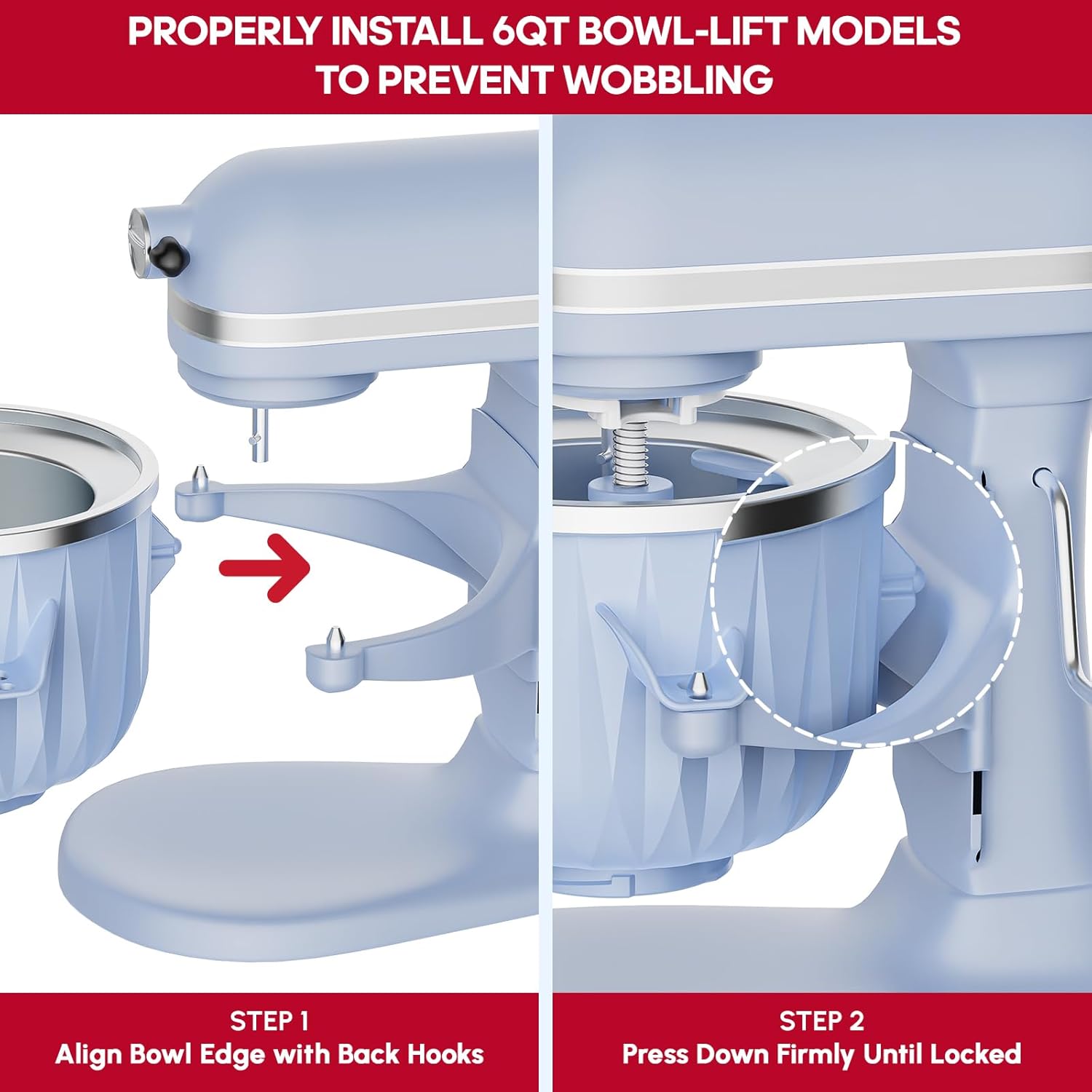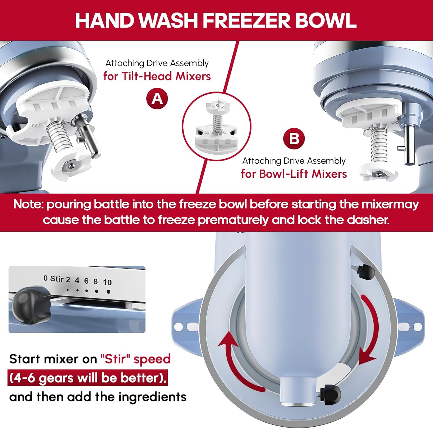- EASY INSTALL: This kitchenaid mixer attachments with a ice cream bowl, dasher and drive assembly. The drive assembly port A is fit for 4.5-5QT Tilt-Head stand mixers, the port B fit for 6QT or larger Bowl-Lift mixers. IMPORTANCE: To install this kitchenaid ice cream attachment for kitchenaid 6QT bowl-lift mixer, please align bowl edge with back hooks first, then press down firmly until locked. Will prevent the ice cream bowl wobbling.
