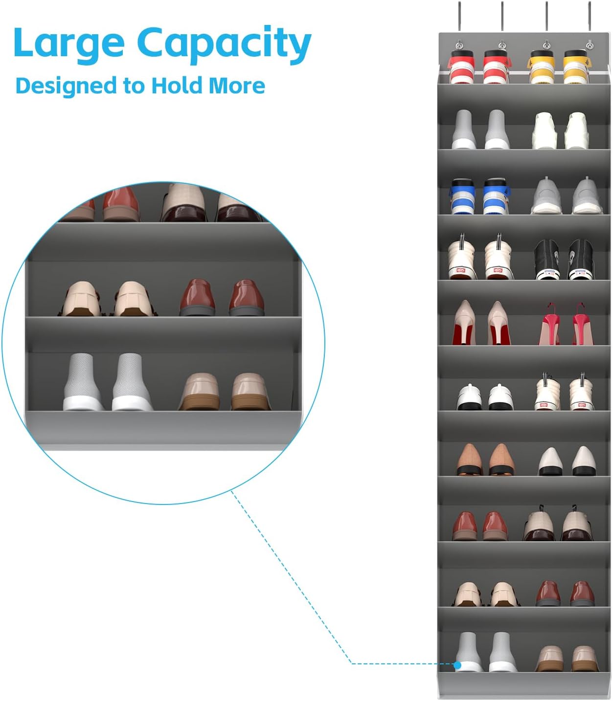 - 【10 Tiers with Large Capacity】This over the door shoe organizer dimension is 74"L x 17"W x 11"D, providing more space than others similar hanging shoe organizer, which is able to hold up to 20-30 pairs of shoes. it's great for most standard and narrow doors, like closet, dorm, wardrobe and pantry room, laundry room.it enables you to store more items, saving your time and making your life relax.