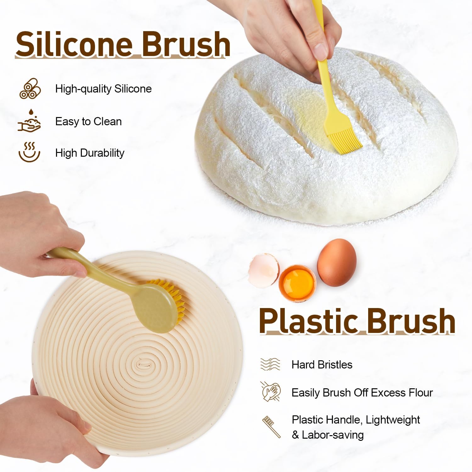 - [What Will You Get] The Sourdough Starter Kit Includes: 1 × 9-Inch Round Banneton Bread Proofing Basket with Linen Liner, 1 × Dough Whisk, 1 × Bread Lame with 5 Blades, 1 × Dough Scraper, 1 × Bowl Scraper, 1 × Silicone Brush, 1 × Cleaning Brush, 1 × Flour Duster, 16 × Baking Stencils, 1 × User Manual. These sourdough bread baking supplies are designed for both beginners and professionals—everything you need to create delicious artisan loaves with ease.
