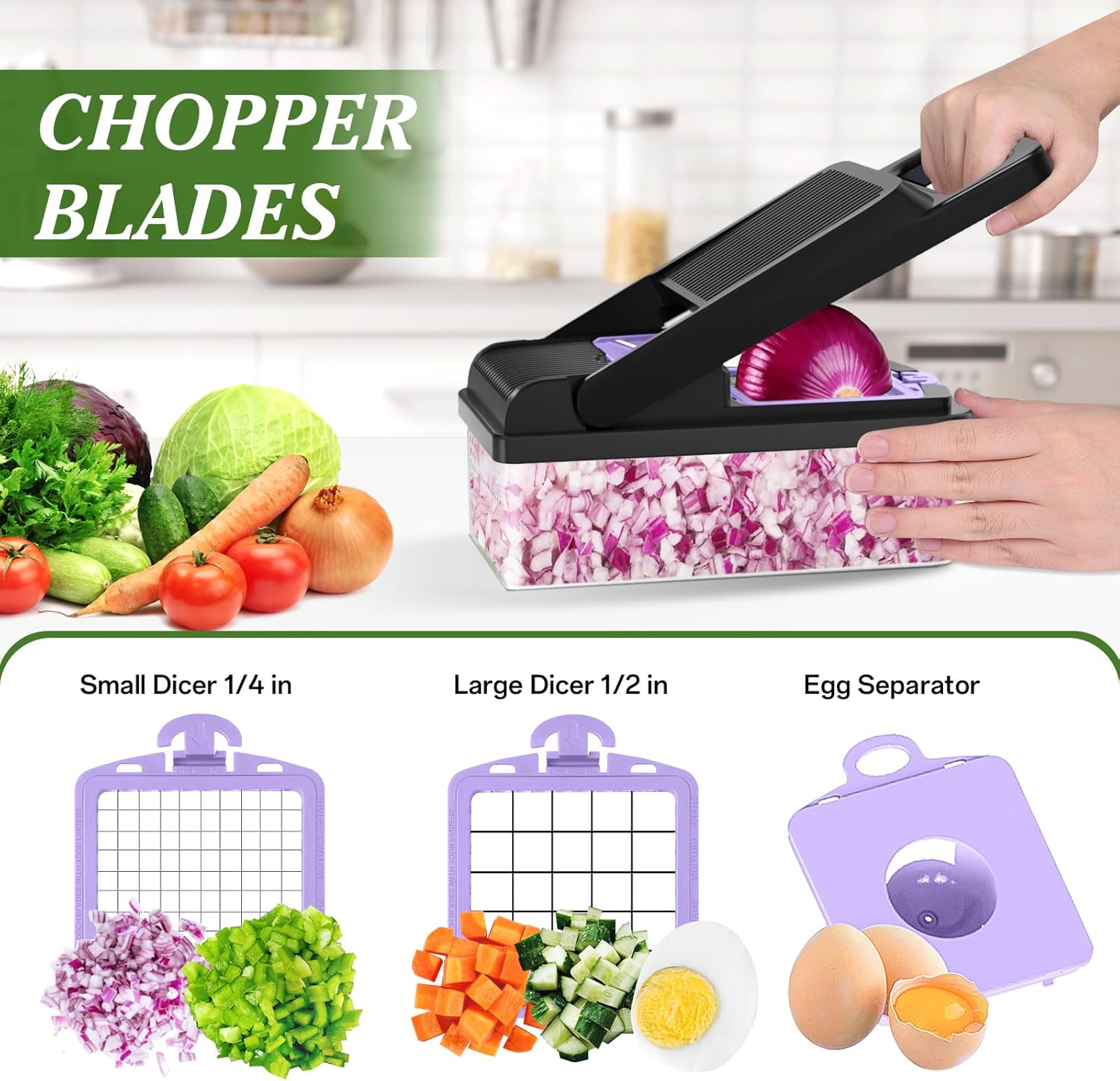 HomeHacks Vegetable Chopper Vegetable Cutter, 12 in 1 Kitchen Gadget, Dicer, Slicer, Onion Cutter, Salad, Cheese Grater & Egg Separator - Multi-Functional Veggie Chopper Lid with Handle (Purple)