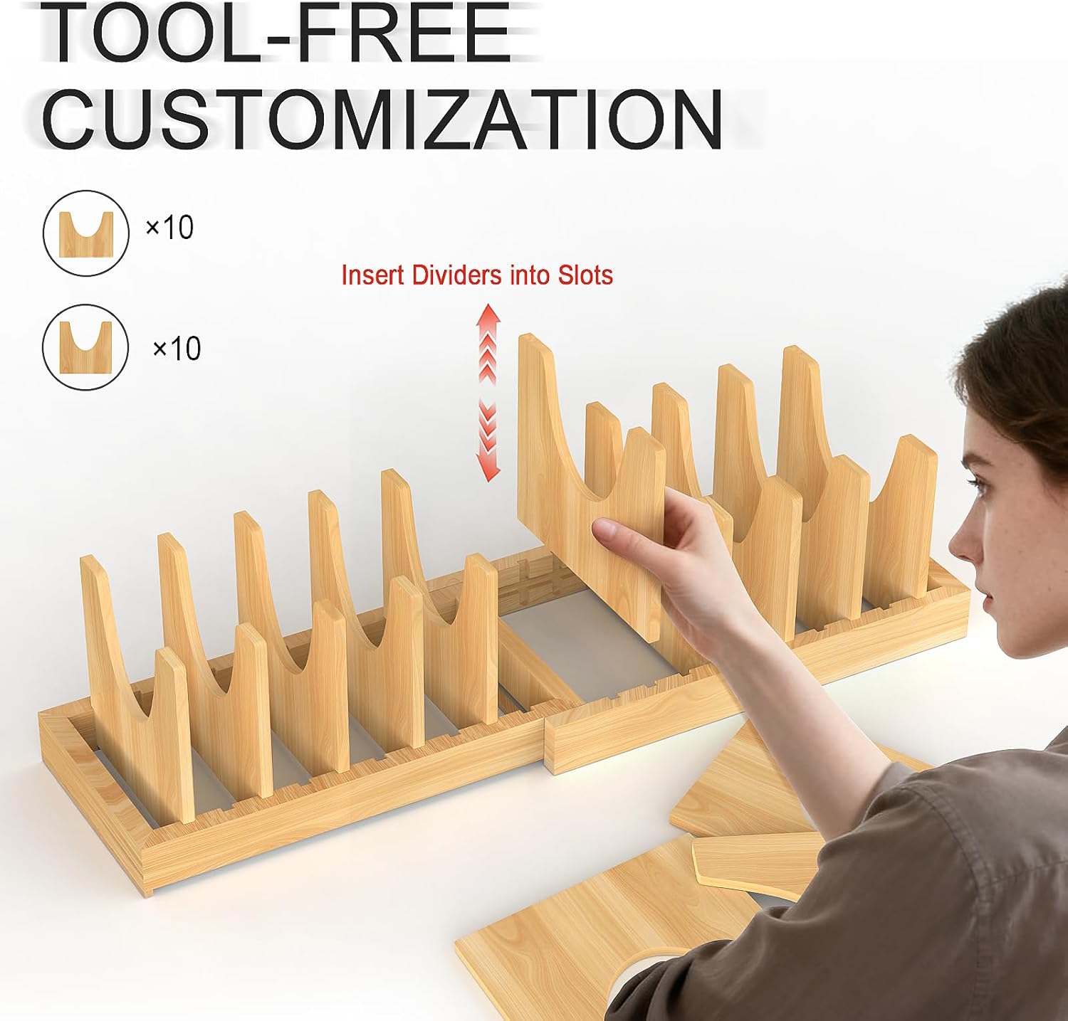 Bamboo Expandable Pot and Pan Organizer Under Cabinet,2-in-1 Kitchen Cabinet Organizer with Adjustable 10 Dividers, Non-Slip Base for Pot Lids Holder, Cutting Board Organizers for Kitchen Storage