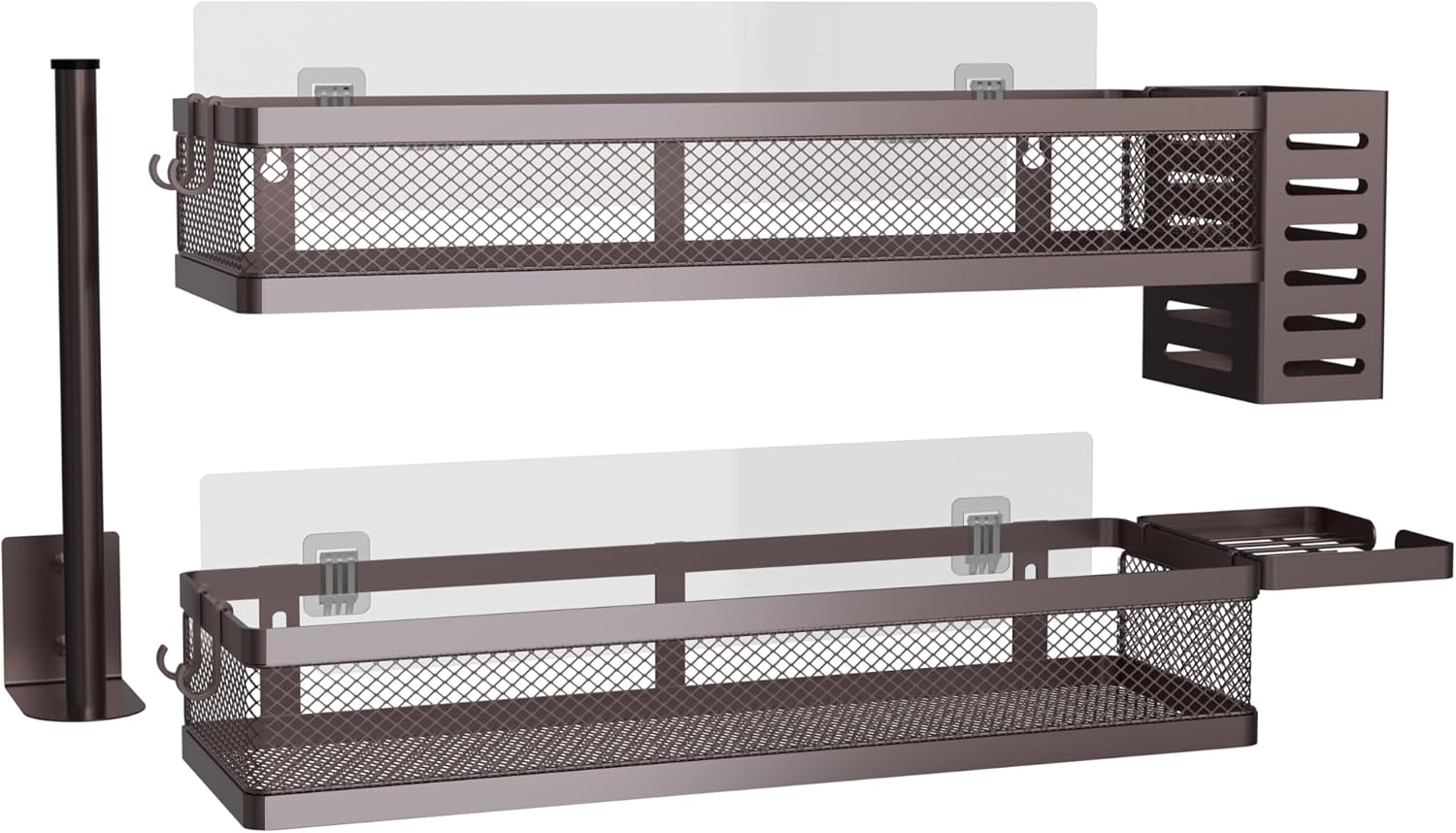 - 【MULTI-PURPOSE&MULTIFUNCTIONAL】5 Hanging Storage Baskets Organizer Set for Sufficient Bathroom Kitchen Storage Space, The bathroom&Kitchen organizer comes with 5 pieces for different uses, including 2 Hanging Storage Baskets, 1 soap holder,1 Tissue holder ,1 utensil holder and 2 adhesives. The perfect solution for organizing a multitude of every items indoor or outdoor. The cabinet organizer hanging baskets wall mount is Ideal for organizing and storing spice bottles, pantry items, snacks, toiletries, tools, craft supplies,etc. And this metal bin basket free up enough space for your homes, kitchen, living room, bathroom, camper, farmhouse, apartments, college dorm rooms, etc.