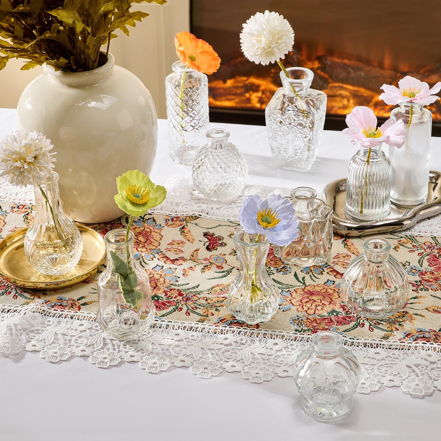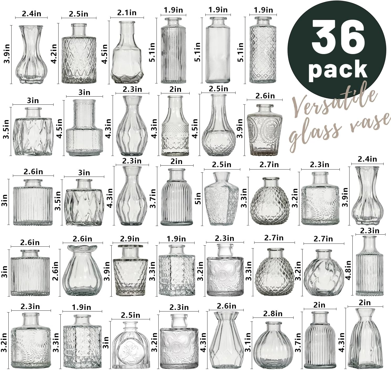 - Versatile Flower Bud Vase Set: This set comprises 36 diverse transparent glass flower bud vases, each adorned with etched designs to further elevate their charm. It is perfectly suited for any home décor. Whether placed as a centerpiece on dining tables, window sills, or wedding banquet tables, these small vintage crystal vases will lend an air of elegance to the setting.