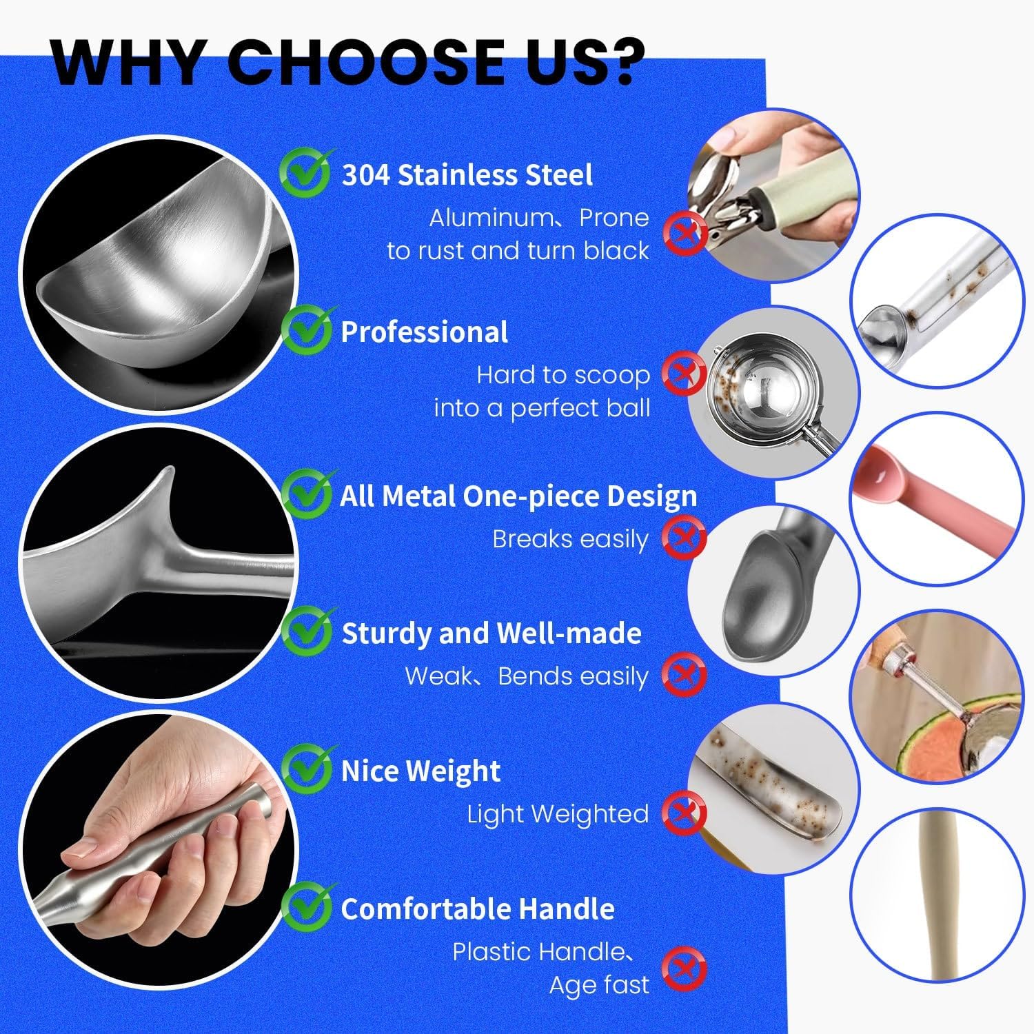 - 304 FOOD-GRADE - Our Ice cream scoop is crafted from premium 304 food-grade stainless steel, ensuring rust-resistance, durability, and a heavy-duty structure. It remains sturdy even when handling the toughest frozen treats without bending or freezing your hand, providing you with a reliable tool for your dessert-serving needs