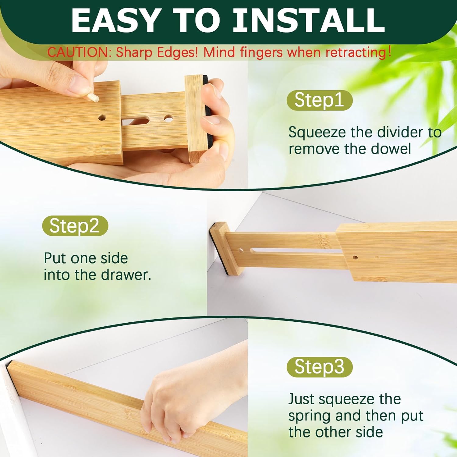 - 【Easy Installation & Removal】Unlike plastic dividers, these bamboo drawer dividers design a built-in spring for adjusting the length of the divider and securely supporting it within the drawer. To install, simply remove the stick from the small hole on the side of the divider. Please use with caution to avoid accidental scratches from the divider snapping open