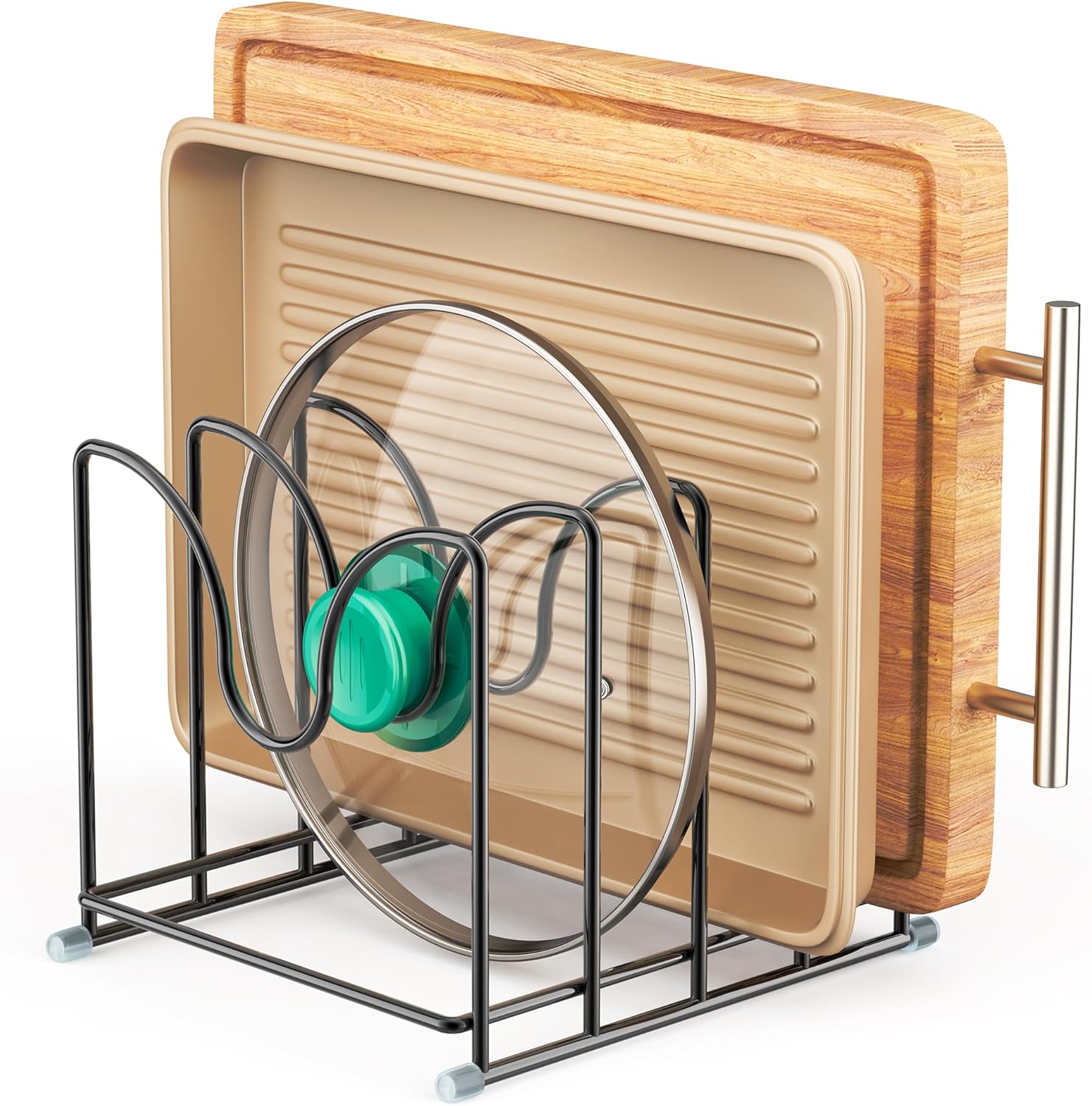 - 【Versatile Design】: Effortlessly organize pot lids ,cutting boards, baking pans, cookie sheets, muffin pans and plates with this kitchen cabinet cutting board rack. It securely holds items and keeps them neatly upright and accessible
