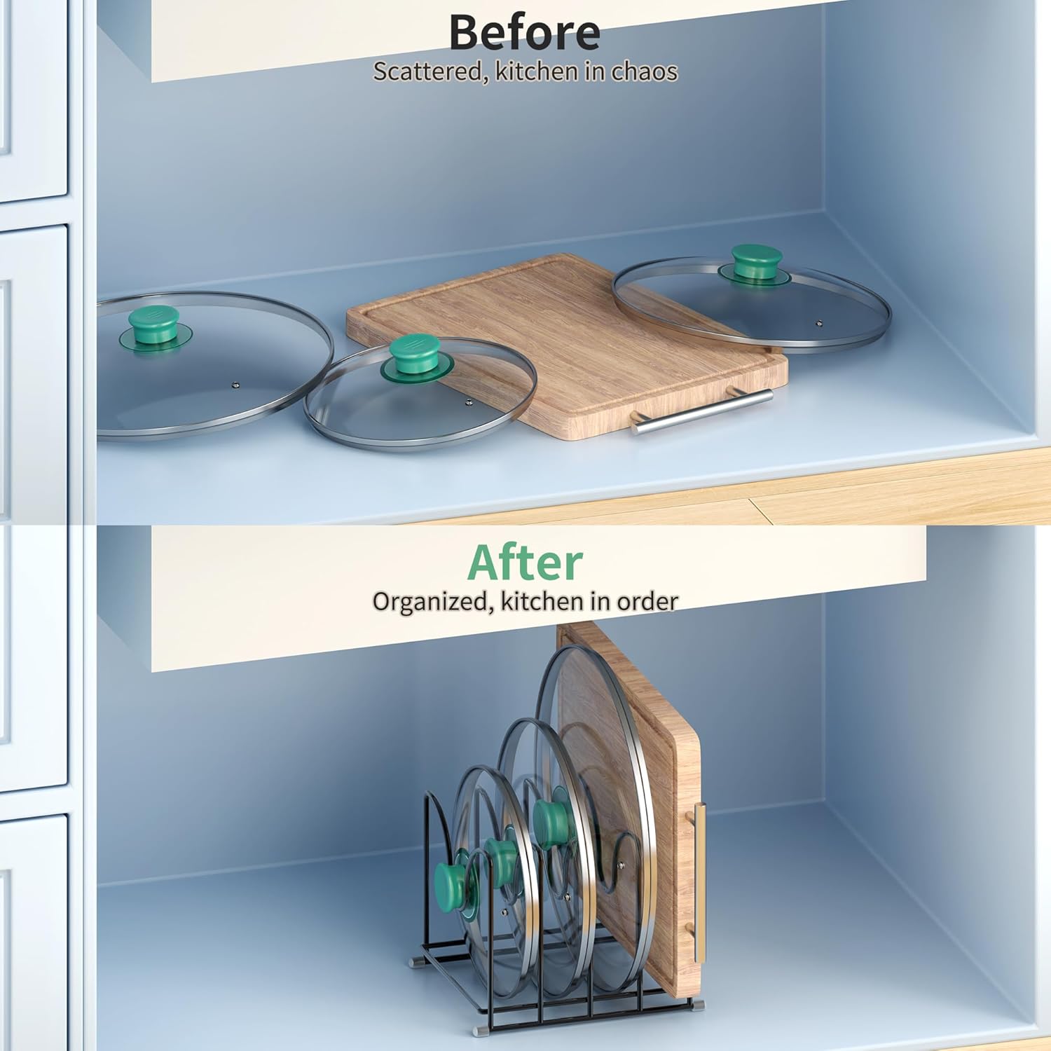 - 【Versatile Design】: Effortlessly organize pot lids ,cutting boards, baking pans, cookie sheets, muffin pans and plates with this kitchen cabinet cutting board rack. It securely holds items and keeps them neatly upright and accessible