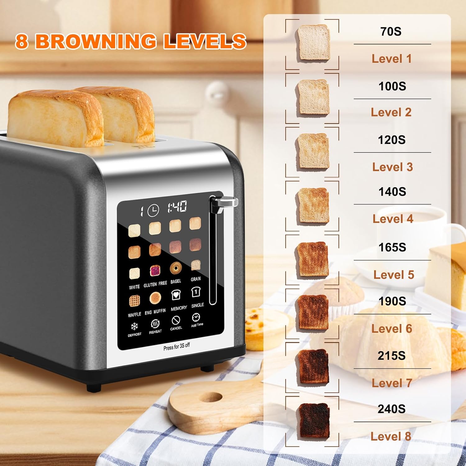 2 Slice Toaster Touch Screen, Stainless Steel Toasters Digital Timer 2 Slot Toasters, 8 Shade Settings 6 Bread Types for Bagel, Cancel, Defrost (Grey)