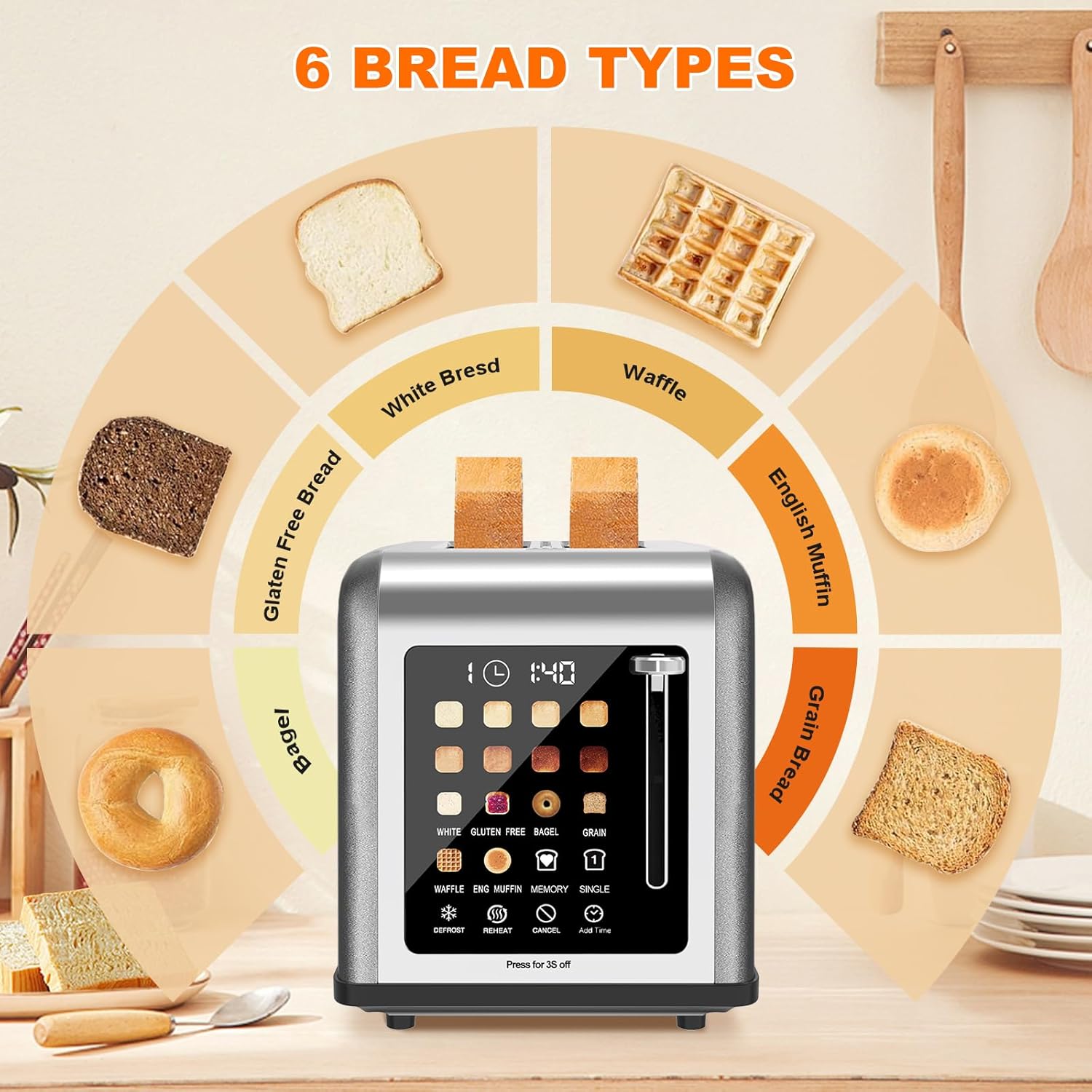 - Digital Display & Touch Screen: The 2 slice toaster has a large to digital display to show the shade setting, bread type and countdown. You can keep track of the remaining time with the visual countdown display on the touch screen control panel.