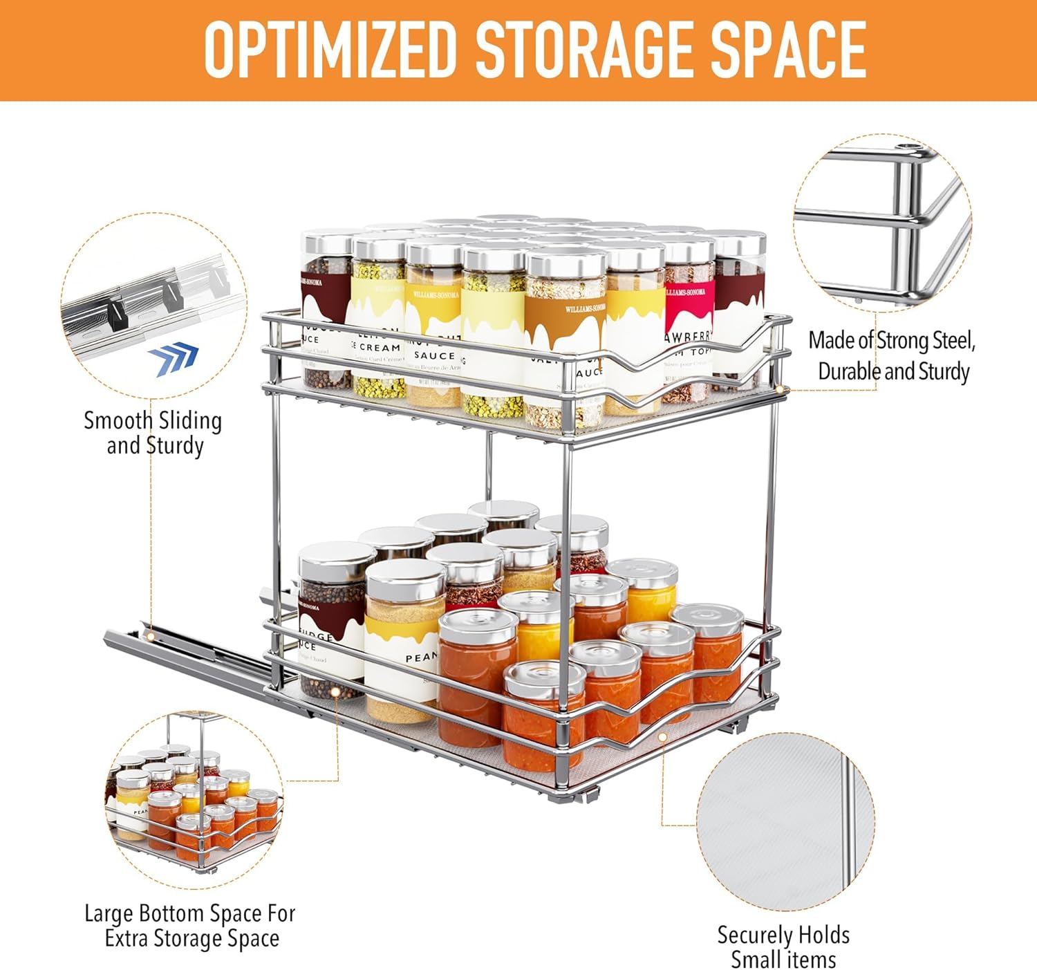 - Durable & Sturdy Construction: Made of solid steel with welded wire mesh, this sliding spice rack is built to last. The heavy-duty engineering-grade slide rails ensure smooth gliding and long-lasting durability, providing a reliable spice storage solution for your kitchen.